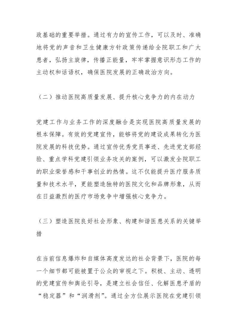 政基础的重要举措。通过有力的宣传工作,可以及时、准确地将党的声音和卫生健康方针政策传递给全院职工和广大患者,弘扬主旋律,传播正能量,牢牢掌握意识形态工作的主动权和话语权,确保医院发展的正确政治方向。(二)推动医院高质量发展、提升核心竞争力的内在动力党建工作与业务工作的深度融合是实现医院高质量发展的根本保障。有效的党建宣传,能够将党的建设成果转化为医院发展的科技优势。通过宣传优秀党员事迹、先进党支部经验、重点学科党建引领业务攻关的案例,可以激发全院职工的职业荣誉感和干事创业的热情。这不仅能提升医疗服务质量和技术水平,更能塑造独特的医院文化和品牌形象,从而在日益激烈的医疗市场竞争中增强核心竞争力。(三)塑造医院良好社会形象、构建和谐医患关系的关键举措在当前信息爆炸和自媒体高度发达的社会背景下,医院的每一个细节都可能被置于公众的审视之下。积极、主动、透明的党建宣传和舆论引导,是建立社会信任、化解医患矛盾的“稳定器”和“润滑剂”。通过全方位展示医院在党建引领