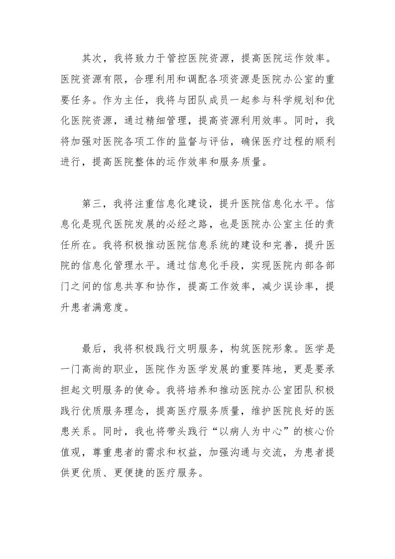 其次,我将致力于管控医院资源,提高医院运作效率。医院资源有限,合理利用和调配各项资源是医院办公室的重要任务。作为主任,我将与团队成员一起参与科学规划和优化医院资源,通过精细管理,提高资源利用效率。同时,我将加强对医院各项工作的监督与评估,确保医疗过程的顺利进行,提高医院整体的运作效率和服务质量。第三,我将注重信息化建设,提升医院信息化水平。信息化是现代医院发展的必经之路,也是医院办公室主任的责任所在。我将积极推动医院信息系统的建设和完善,提升医院的信息化管理水平。通过信息化手段,实现医院内部各部门之间的信息共享和协作,提高工作效率,减少误诊率,提升患者满意度。最后,我将积极践行文明服务,构筑医院形象。医学是一门高尚的职业,医院作为医学发展的重要阵地,更是要承担起文明服务的使命。我将培养和推动医院办公室团队积极践行优质服务理念,提高医疗服务质量,维护医院良好的医患关系。同时,我也将带头践行“以病人为中心”的核心价值观,尊重患者的需求和权益,加强沟通与交流,为患者提供更优质、更便捷的医疗服务。