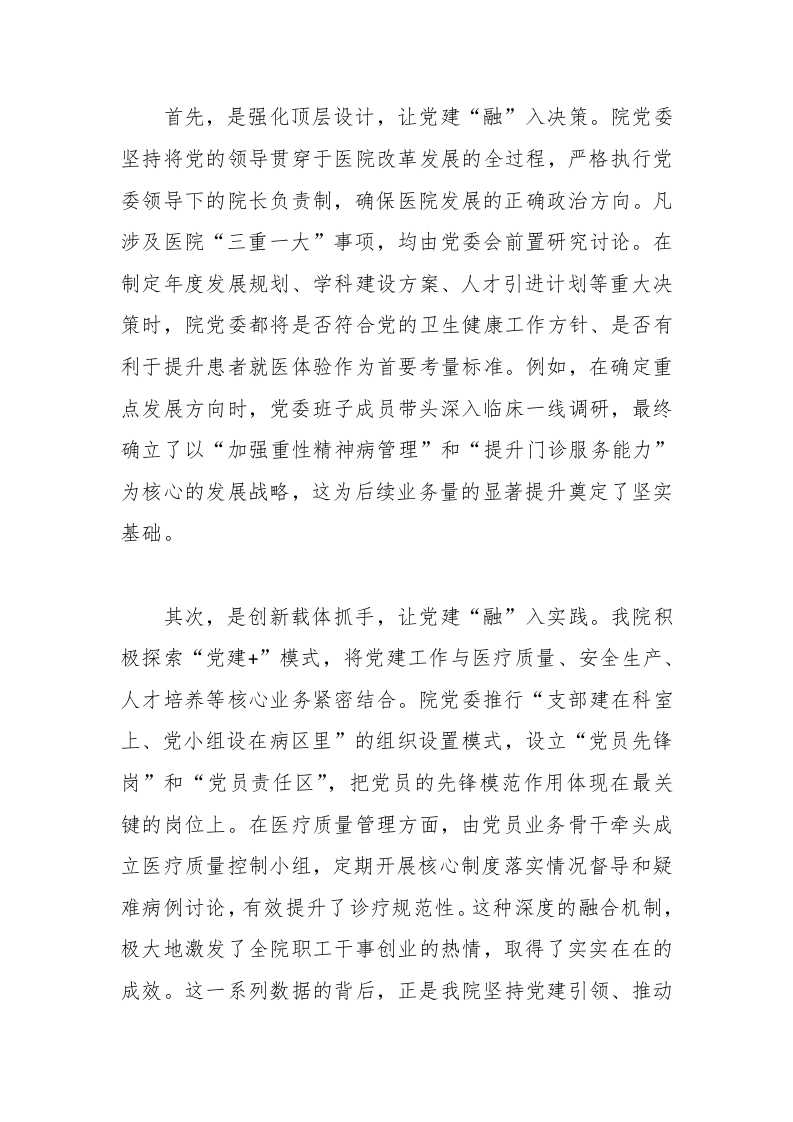 首先,是强化顶层设计,让党建“融”入决策。院党委坚持将党的领导贯穿于医院改革发展的全过程,严格执行党委领导下的院长负责制,确保医院发展的正确政治方向。凡涉及医院“三重一大”事项,均由党委会前置研究讨论。在制定年度发展规划、学科建设方案、人才引进计划等重大决策时,院党委都将是否符合党的卫生健康工作方针、是否有利于提升患者就医体验作为首要考量标准。例如,在确定重点发展方向时,党委班子成员带头深入临床一线调研,最终确立了以“加强重性精神病管理”和“提升门诊服务能力”为核心的发展战略,这为后续业务量的显著提升奠定了坚实基础。其次,是创新载体抓手,让党建“融”入实践。我院积极探索“党建+”模式,将党建工作与医疗质量、安全生产、人才培养等核心业务紧密结合。院党委推行“支部建在科室上、党小组设在病区里”的组织设置模式,设立“党员先锋岗”和“党员责任区”,把党员的先锋模范作用体现在最关键的岗位上。在医疗质量管理方面,由党员业务骨干牵头成立医疗质量控制小组,定期开展核心制度落实情况督导和疑难病例讨论,有效提升了诊疗规范性。这种深度的融合机制,极大地激发了全院职工干事创业的热情,取得了实实在在的成效。这一系列数据的背后,正是我院坚持党建引领、推动