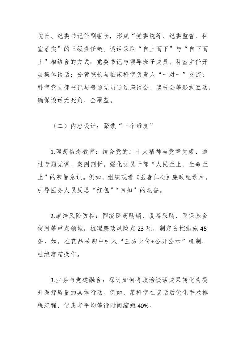 院长、纪委书记任副组长,形成“党委统筹、纪委监督、科室落实”的三级责任链。谈话采取“自上而下”与“自下而上”相结合的方式:党委书记与领导班子成员、科室主任开展集体谈话;分管院长与临床科室负责人“一对一”交流;科室党支部书记与普通党员通过座谈会、读书会等形式互动,确保谈话无死角、全覆盖。(二)内容设计:聚焦“三个维度”1.理想信念教育:结合党的二十大精神与党章党规,通过专题党课、案例剖析,强化党员干部“人民至上、生命至上”的宗旨意识。例如,组织观看《医者仁心》廉政纪录片,引导医务人员反思“红包”“回扣”的危害。2.廉洁风险防控:围绕医药购销、设备采购、医保基金使用等重点领域,梳理廉政风险点23项,制定防控措施45条。如,在药品采购中引入“三方比价+公开公示”机制,杜绝暗箱操作。3.业务与党建融合:探讨如何将政治谈话成果转化为提升医疗质量的具体行动。例如,某科室在谈话后优化手术排程流程,使患者平均等待时间缩短40%。