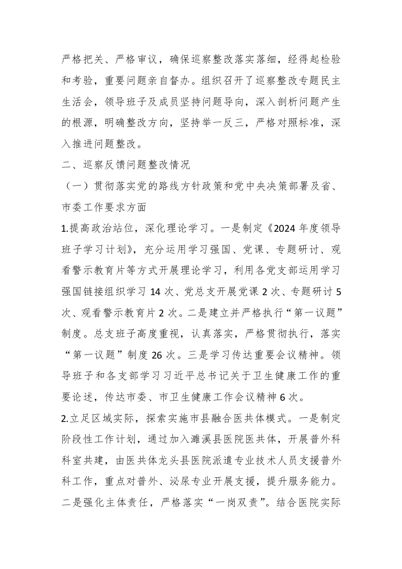 严格把关、严格审议,确保巡察整改落实落细,经得起检验和考验,重要问题亲自督办。组织召开了巡察整改专题民主生活会,领导班子及成员坚持问题导向,深入剖析问题产生的根源,明确整改方向,坚持举一反三,严格对照标准,深入推进问题整改。二、巡察反馈问题整改情况(一)贯彻落实党的路线方针政策和党中央决策部署及省、市委工作要求方面1.提高政治站位,深化理论学习。一是制定《2024年度领导班子学习计划》,充分运用学习强国、党课、专题研讨、观看警示教育片等方式开展理论学习,利用各党支部运用学习强国链接组织学习14次、党总支开展党课2次、专题研讨5次、观看警示教育片2次。二是建立并严格执行“第一议题”制度。总支班子高度重视,认真落实,严格贯彻执行,落实“第一议题”制度26次。三是学习传达重要会议精神。领导班子和各支部学习习近平总书记关于卫生健康工作的重要论述,传达市委、市卫生健康工作会议精神6次。2立足区域实际,探索实施市县融合医共体模式。一是制定阶段性工作计划,通过加入濉溪县医院医共体,开展普外科科室共建,由医共体龙头县医院派遣专业技术人员支援普外科工作,重点对普外、泌尿专业开展支援,提升服务能力。二是强化主体责任,严格落实“一岗双责”。结合医院实际