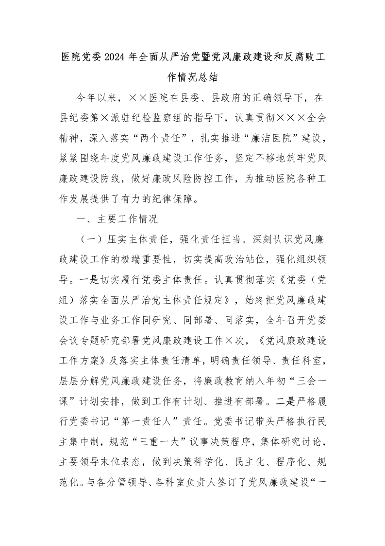 医院党委2024年全面从严治党暨党风廉政建设和反腐败工作情况总结今年以来,××医院在县委、县政府的正确领导下,在县纪委第×派驻纪检监察组的指导下,认真贯彻×××全会精神,深入落实“两个责任”,扎实推进“廉洁医院”建设,紧紧围绕年度党风廉政建设工作任务,坚定不移地筑牢党风廉政建设防线,做好廉政风险防控工作,为推动医院各种工作发展提供了有力的纪律保障。一、主要工作情况(一)压实主体责任,强化责任担当。深刻认识党风廉政建设工作的极端重要性,切实提高政治站位,强化组织领导。一是切实履行党委主体责任。认真贯彻落实《党委(党组)落实全面从严治党主体责任规定》,始终把党风廉政建设工作与业务工作同研究、同部署、同落实,全年召开党委会议专题研究部署党风廉政建设工作×次,《党风廉政建设工作方案》及落实主体责任清单,明确责任领导、责任科室,层层分解党风廉政建设任务,将廉政教育纳入年初“三会课”计划安排,做到工作有计划、推进有部署。二是严格履行党委书记“第一责任人”责任。党委书记带头严格执行民主集中制,规范“三重一大”议事决策程序,集体研究讨论,主要领导末位表态,做到决策科学化、民主化、程序化、规范化。与各分管领导、各科室负责人签订了党风廉政建设“一