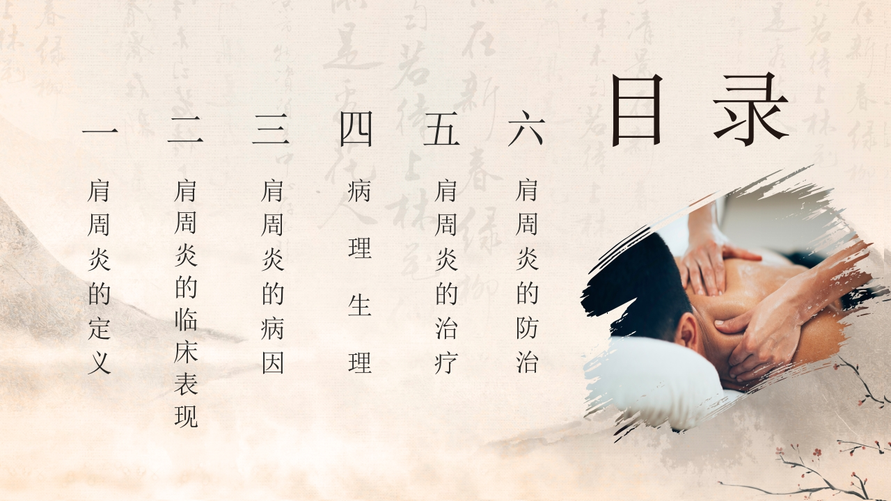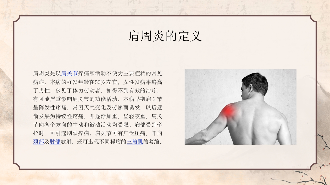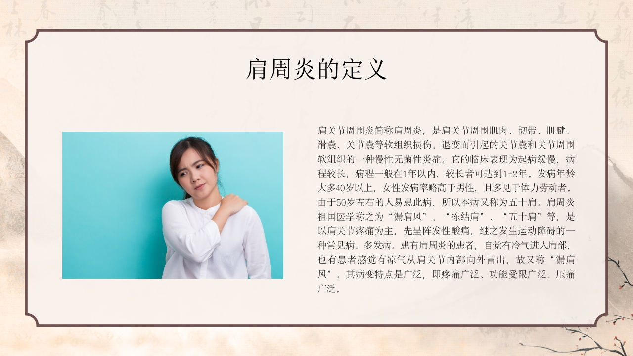 传/承/古/法/中/医/守/护/人/类/健/康肩周炎的中医护理肩周炎的发生与肩部受到寒冷刺激有关,要避免肩部着凉,要根据天气变化适当添加衣物,晚上睡觉时也要注意盖好被子汇报:XX日期:2023.9