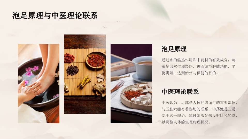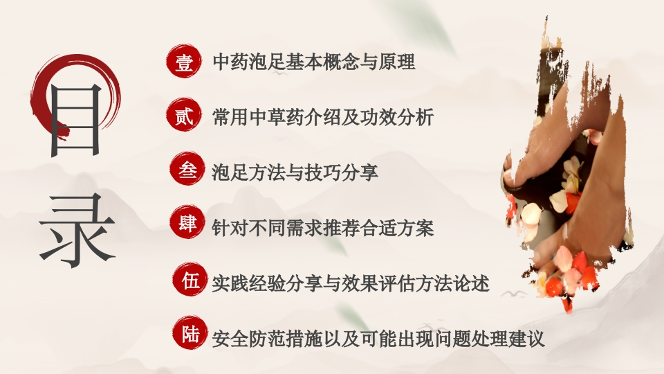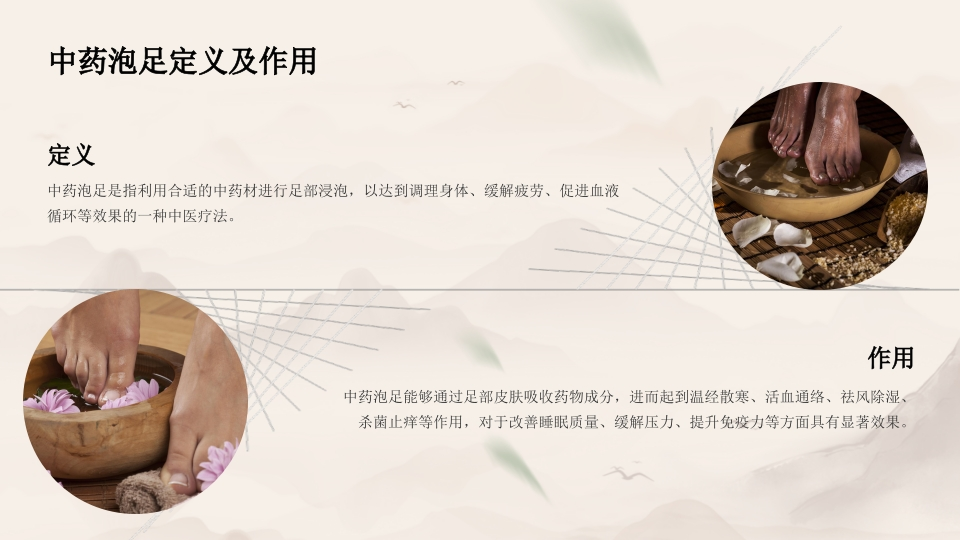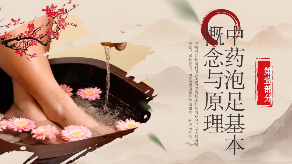 演讲人:时间:女年文月身体、缓解疲劳、促进血液循环等效果的一种中医疗法。中药泡足是指利用合适的中药材进行足部浸泡,以达到调理药泡足