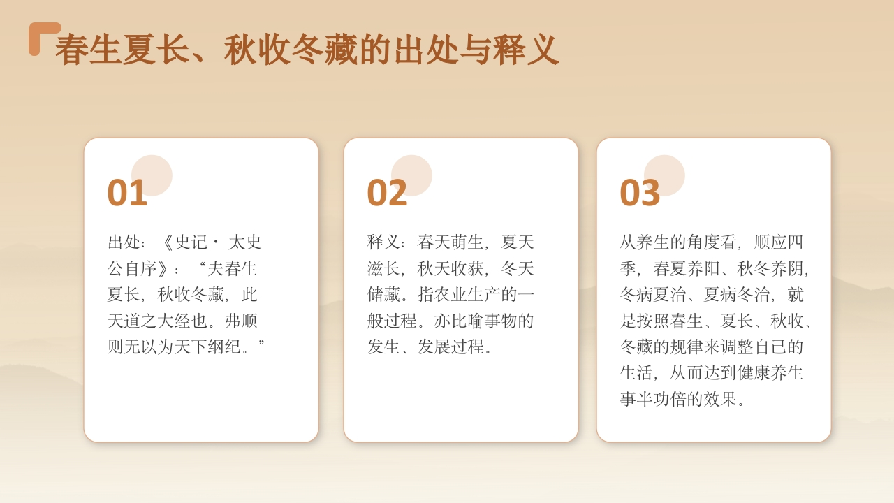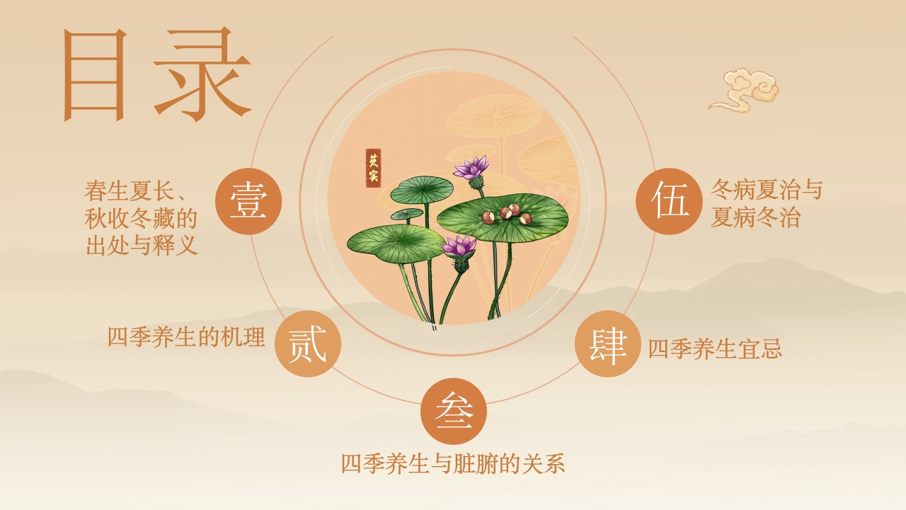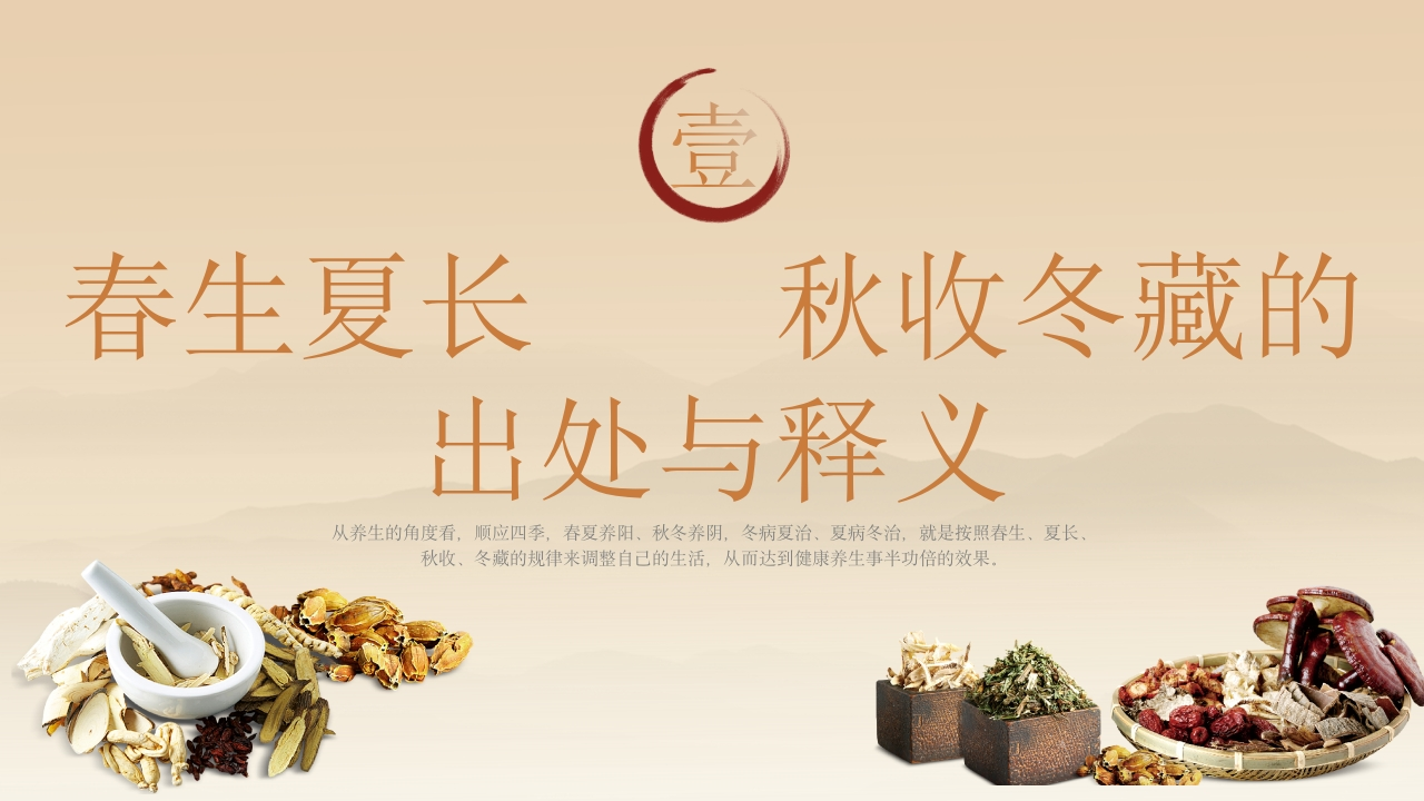 中如养社春生,夏长,秋收,冬藏从养生的角度看,顺应四季,春夏养阳、秋冬养阴,冬病夏治、夏病冬治,就是按照春生、夏长秋收、冬藏的规律来调整自己的生活,从而达到健康养生事半功倍的效果。汇报:XX时间:20XX年