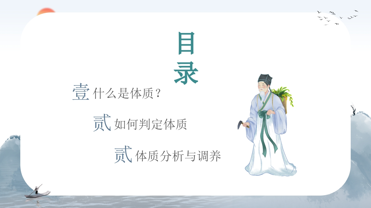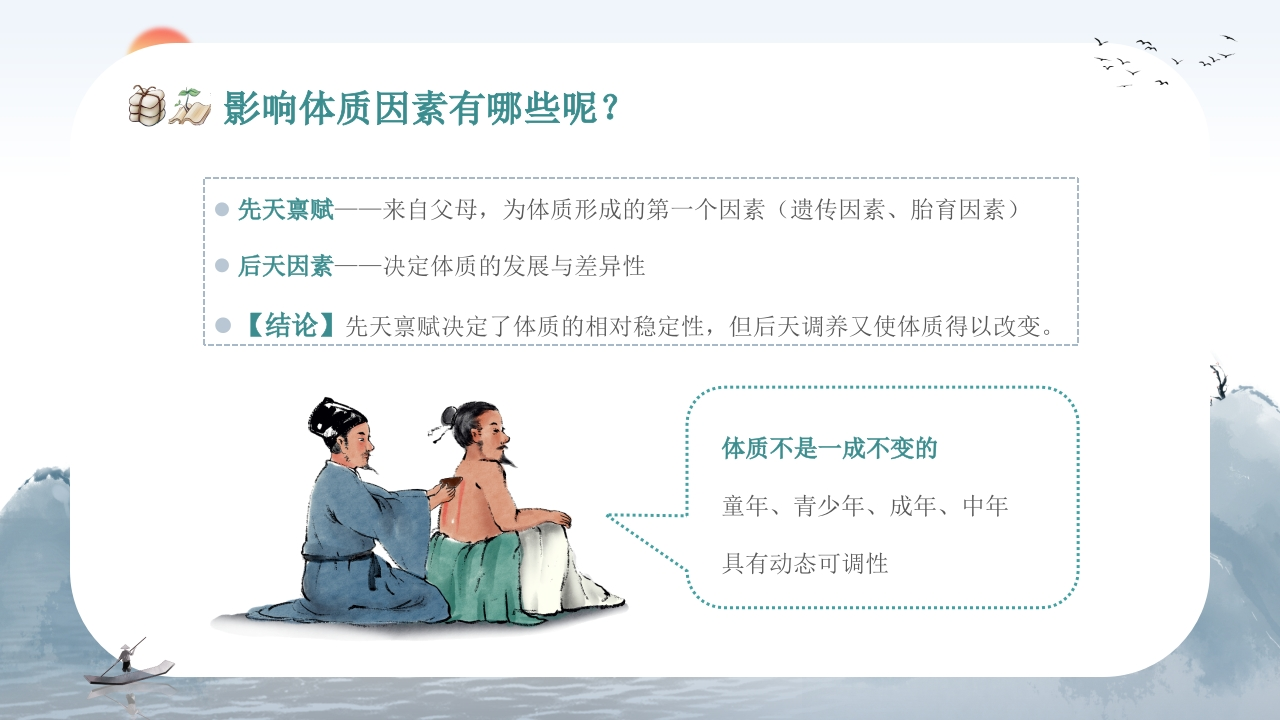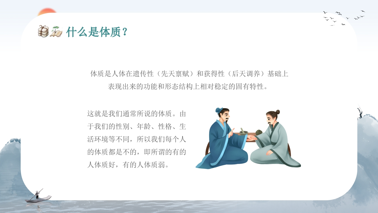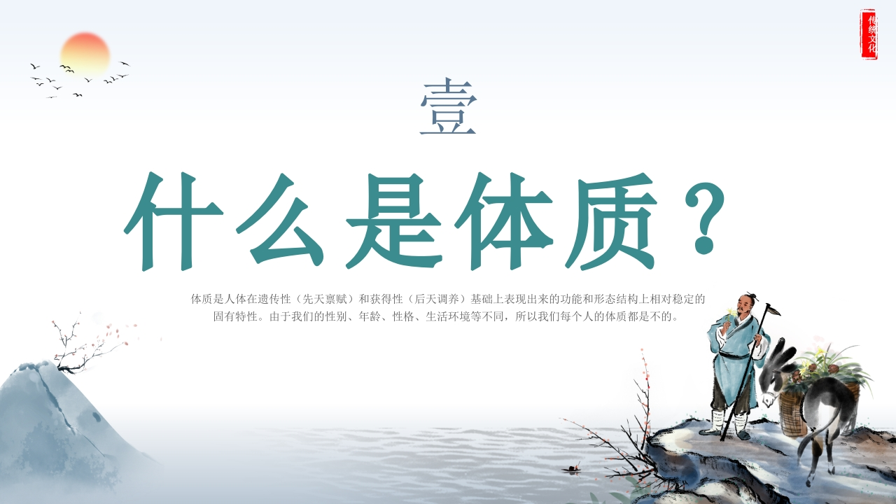 传统文化正气存内邪不可中医体质辨识中医宣讲推广专题培训体质是人体在遗传性(先天禀赋)和获得性(后天调养)基础上表现出来的功能和形态结构上相对稳定的固有特性。由于我们的性别、年龄、性格、生活环境等不同,所以我们每个人的体质都是不的。培训人:XX时间:XX·10