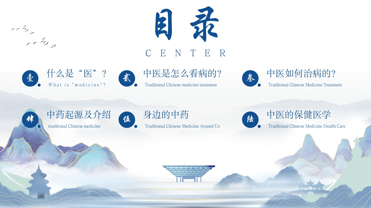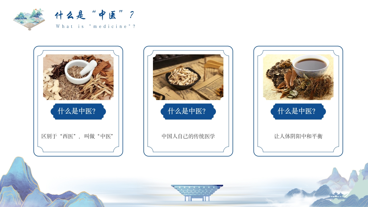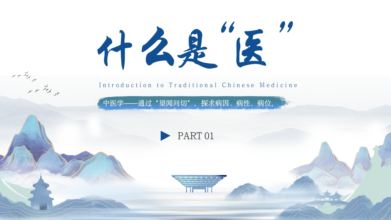 祖国的传统医学Traditional Chinese Medicine:Traditional Chinese Medicine of the Motherland中医学通过“望闻问切”,探求病因、病性、病位主讲人:XX时间:20XX/XX
