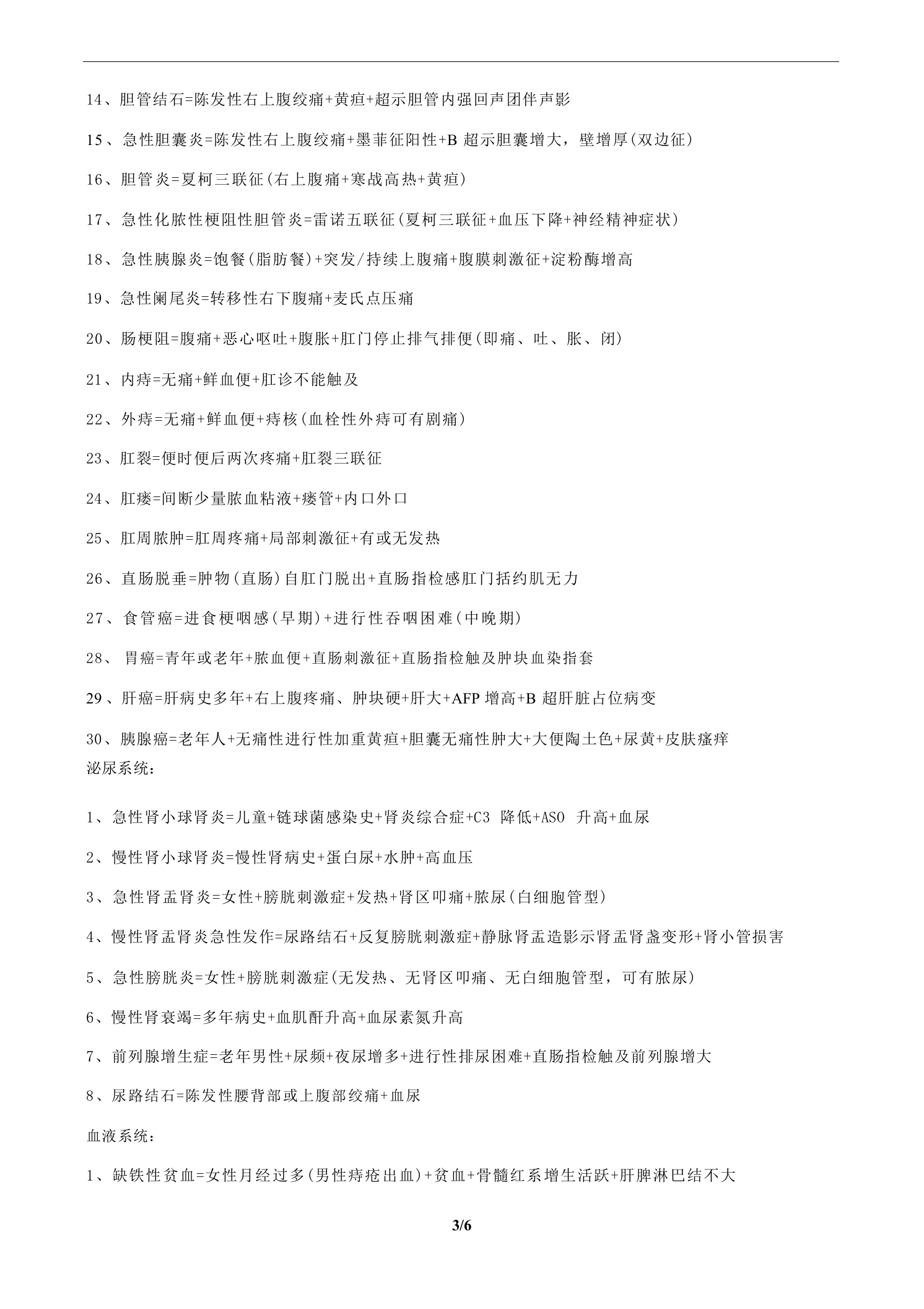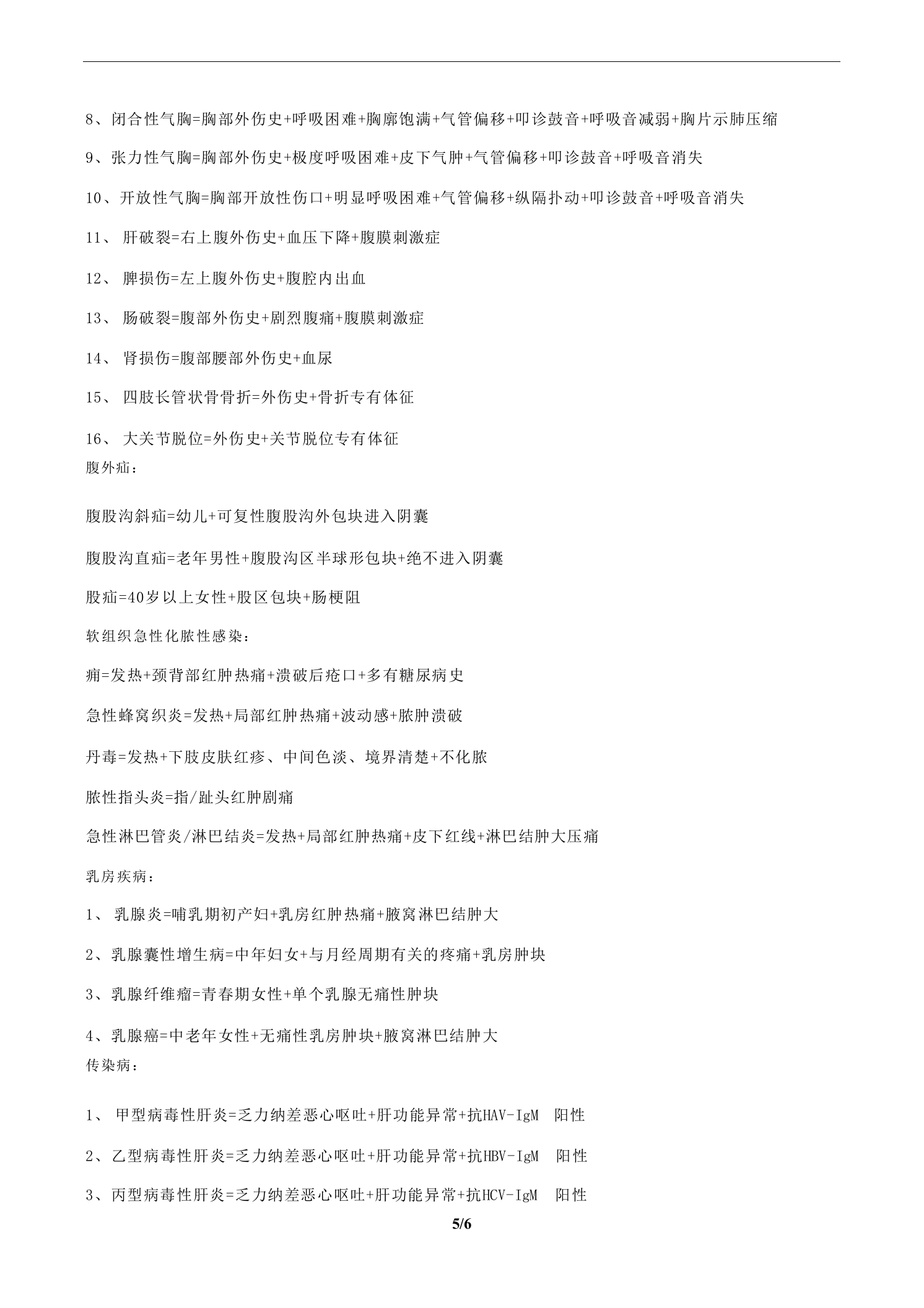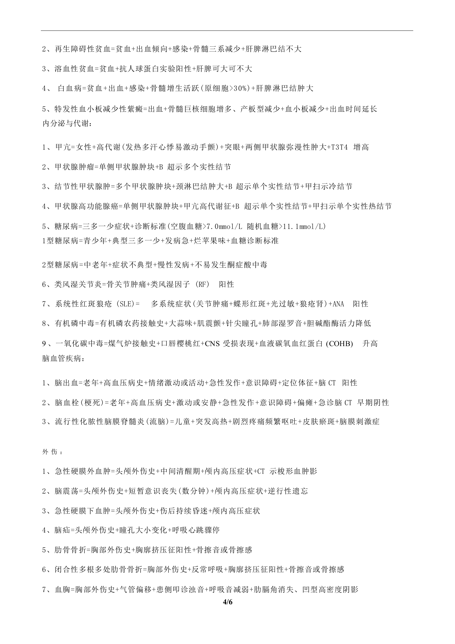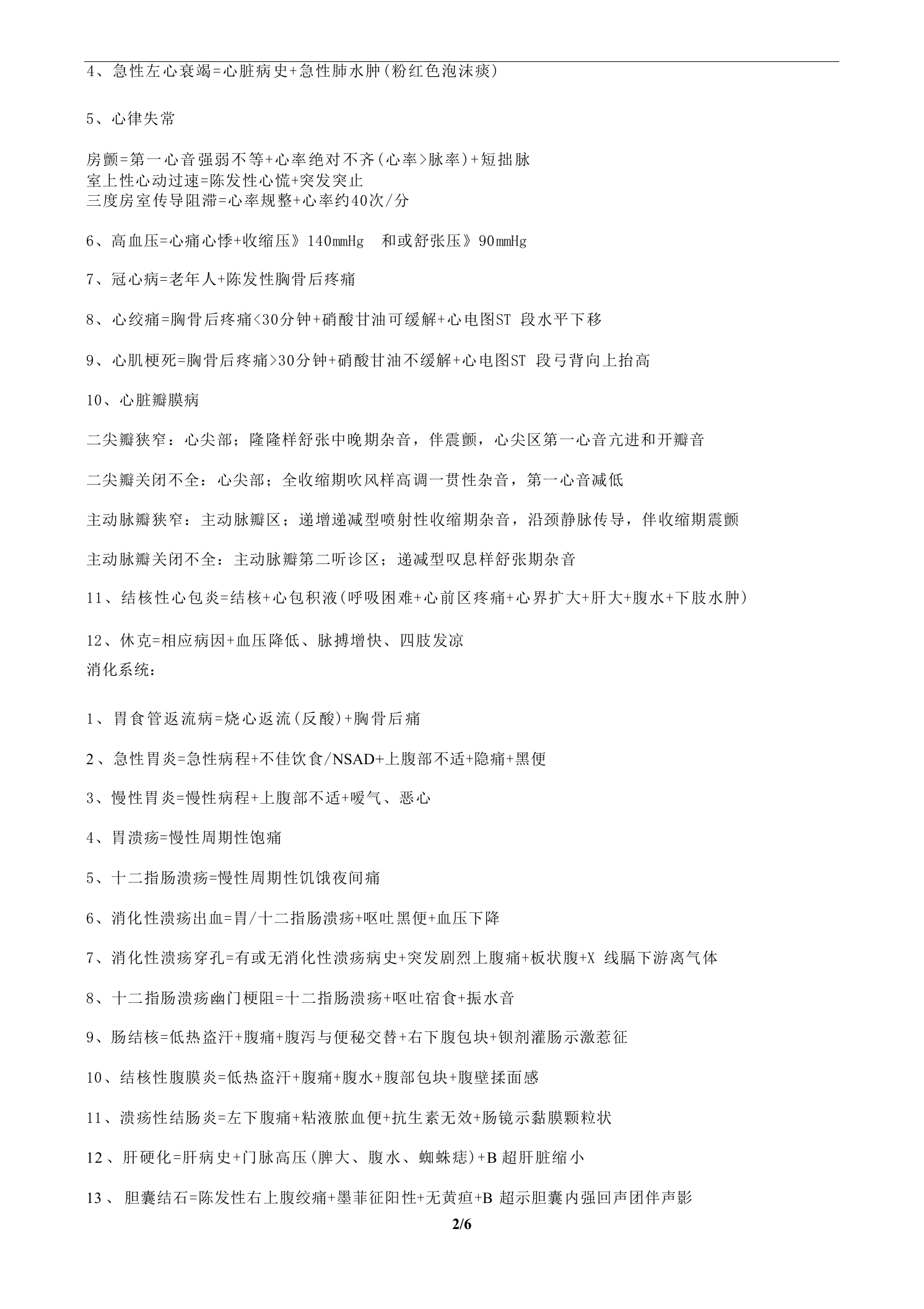 住院医师规范化培训结业临床实践能力疾病诊断公式实践技能第一站和笔试都能用到。呼吸系统:1、肺炎=短期咳嗽咳痰+发热+肺部湿罗音+胸片2、肺炎球菌肺炎=成人+着凉+高热+口角及鼻子周围单纯胞疹+咳铁锈色痰3、葡萄球菌肺炎=突发高热+胸痛+肌肉酸痛+脓血痰+胸片状影4、支原体肺炎=儿童或成年+刺激干咳+肌肉酸痛+青霉素或头孢类无效+胸片浸润影5、克雷伯杆菌肺炎=老年+高热+砖红色胶冻样痰+胸片空洞6、肺结核=青年+长期低热盗汗+咳血+抗生素无效+白细胞不高7、原发性肺结核=儿童+轻微症状+胸片哑铃阴影8、急性粟粒性肺结核=幼儿或青少年+结核+严重中毒症状+胸片三均匀(大小、密度、分布)的粟粒状结节9、浸润性肺结核=青年+结核+肺尖或锁骨下斑点状阴影10、纤维空洞性肺结核=成人+长期低热盗汗+胸片肺组织严重破坏、空洞、肺纹理垂柳样11、干酪样肺炎=结核+高热+胸片大叶性密度均匀玻璃状阴影12、结核性胸膜炎=结核+胸腔积液征(胸痛+语音震颤消失+叩诊实音呼吸音消失)13、胸腔积液=一侧胸痛+呼吸困难+纵隔偏移+患肺呼吸音消失、叩诊浊音14、恶性胸腔积液=老年+低热盗汗+一侧胸痛+呼吸困难+纵隔偏移+患肺呼吸音消失、叩诊浊音15、结核性胸腔积液=青年+低热盗汗+一侧胸痛+呼吸困难+纵隔偏移+患肺呼吸音消失、叩诊浊音16、COPD=老年+长期咳痰喘+桶状胸+PEV1/FVC<70%+RV/TLC>40%17、慢性肺心病=C0PD+肺动脉高压+右心室肥大(P2>A2、颈静脉怒张、肝大、肝颈征阳性、下肢水肿)18、支气管哮喘=反复发作性哮喘或咳嗽+满肺哮鸣音+过敏史19、肺癌=中老年+痰中血丝+刺激性咳嗽+消瘦+固定局限性湿罗音+吸烟20、呼吸衰竭=PaO2<60mmHg或/和PaC02>50mmHgI型呼衰=病程短+PaO2<60 mmHgPaC02正常IⅡ型呼衰=长期肺病+缺氧+PaO2<60mmHg和PaCO2>50mmHg循环系统:1、慢性左心衰竭=长期心脏病史+心排量减低+肺循环淤血(心源性哮喘、呼吸困难)2、慢性右心衰竭=长期心脏病史+心排量减低+体循环淤血(颈静脉怒张、肝大、腹水、双下肢水肿)3、慢性全心衰竭=慢性左心衰竭+慢性右心衰竭2/6