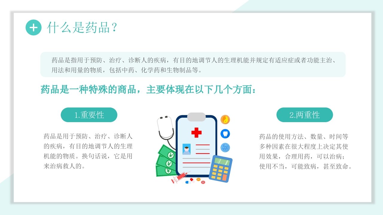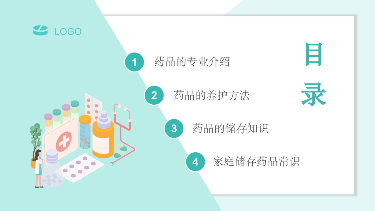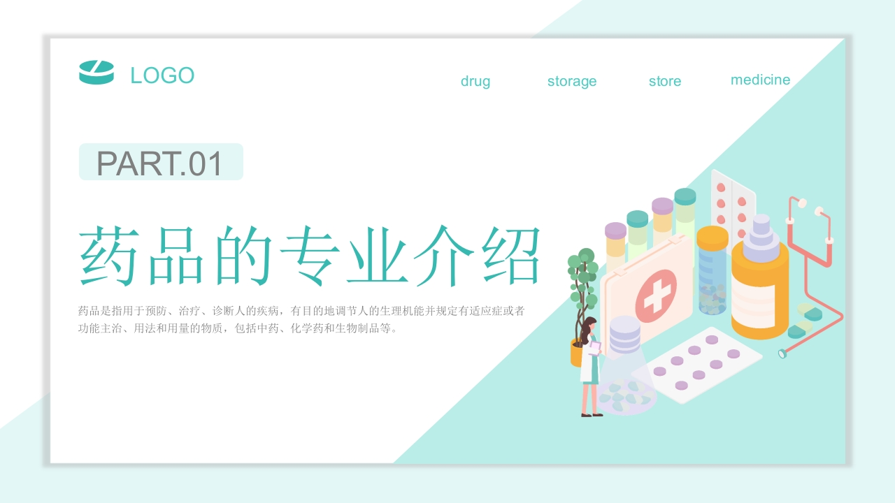 LOGOdrugstoragestoremedicineDrug storage andI maintenance药品储存与养护医疗护理I药品储存I药品养护I药品常识药品是指用于预防、治疗、诊断人的疾病,有目的地调节人的生理机能并规定有适应症或者功能主治、用法和用量的物质,包括中药、化学药和生物制品等。主讲人:X时间:XX.XX