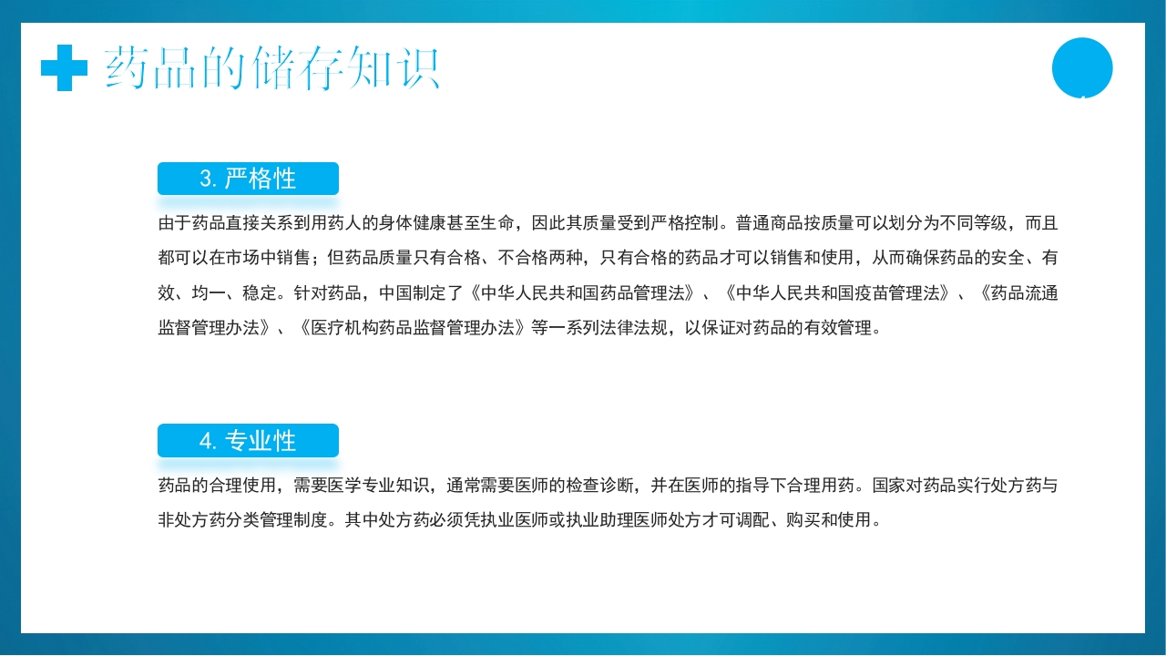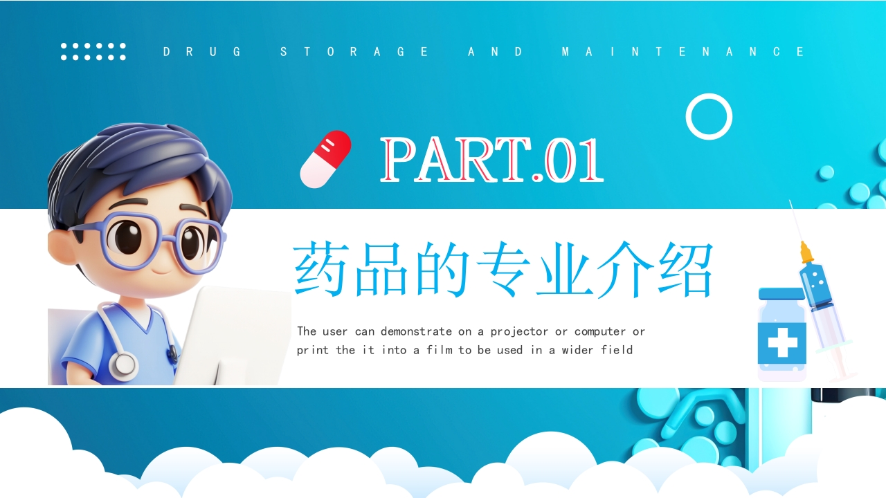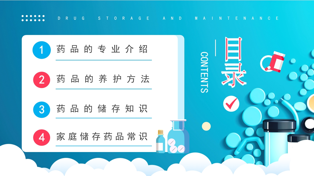 ●●●●●●●●●●DRUG STORAGE AND MAINTENANCE药品诣存与养护医疗护理!药品储存!药品养护!药品常识药品是指用于预防、治疗、诊断人的疾病,有目的地调节人的生理机能并规定有适应症或者功能主治、用法和用量的物质,包括中药、化学药和生物制品等。主讲:XX时间:202X.X