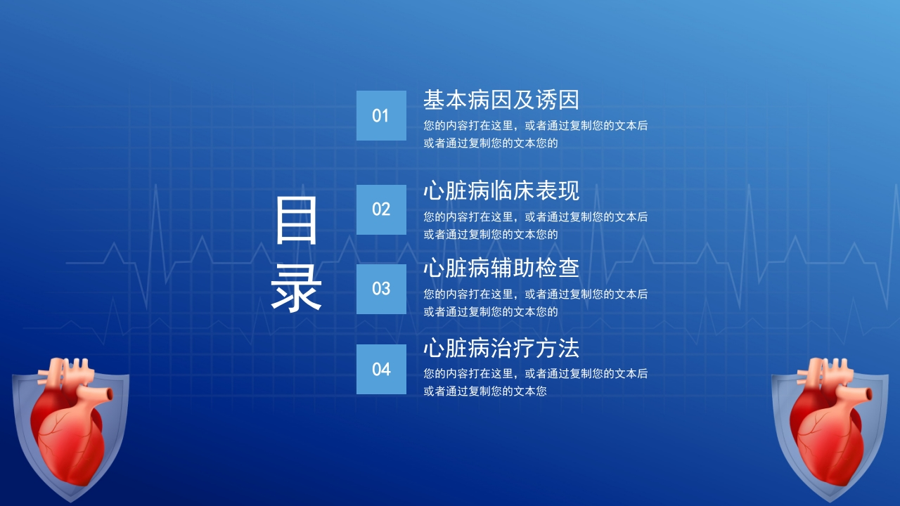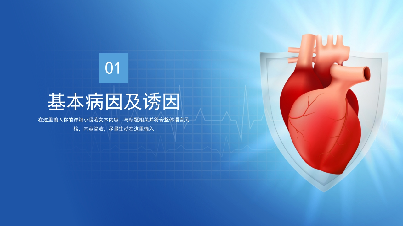 内科护理学心脏病医疗护理简约心脏病医疗护理知识普及PPT模板您的内容打在这里,或者通过复制您的文本后,在此框中选择粘贴,并选择只保留文字。在此录入上述图表的综合描述说明,在此录入主讲:Xxx时间:xx年x月x日