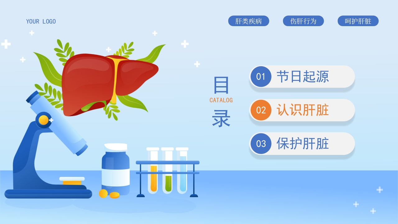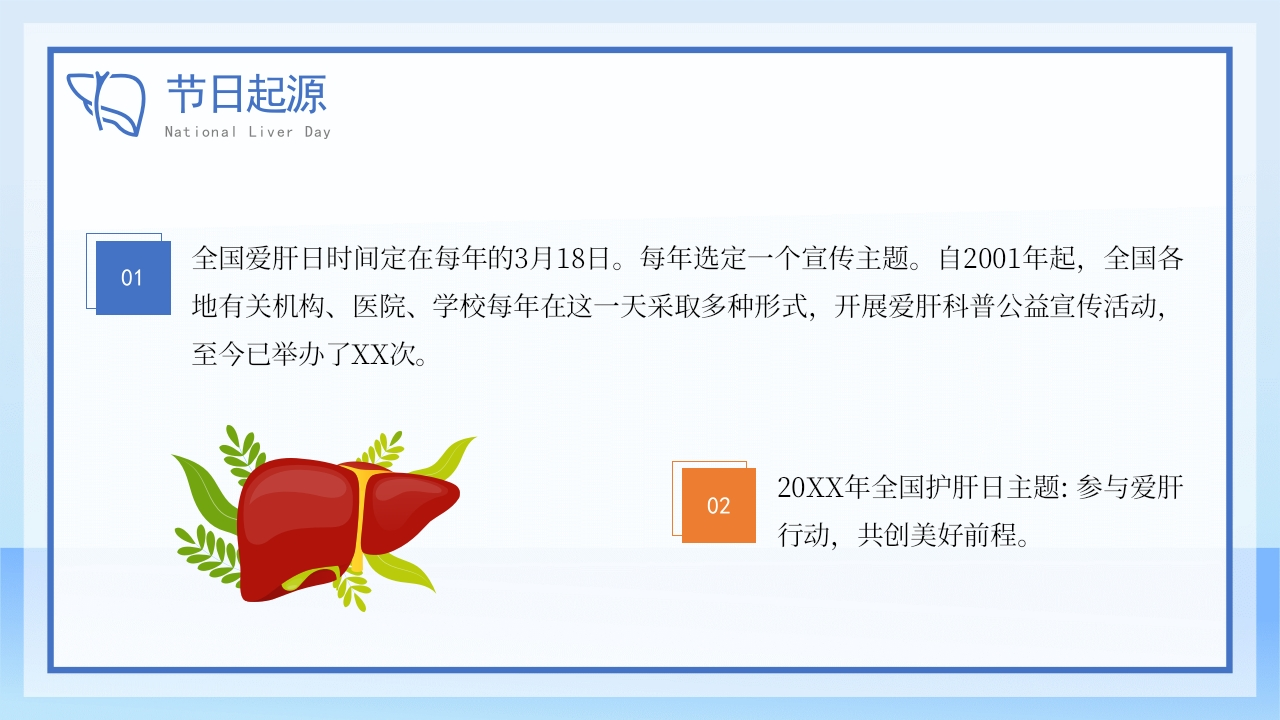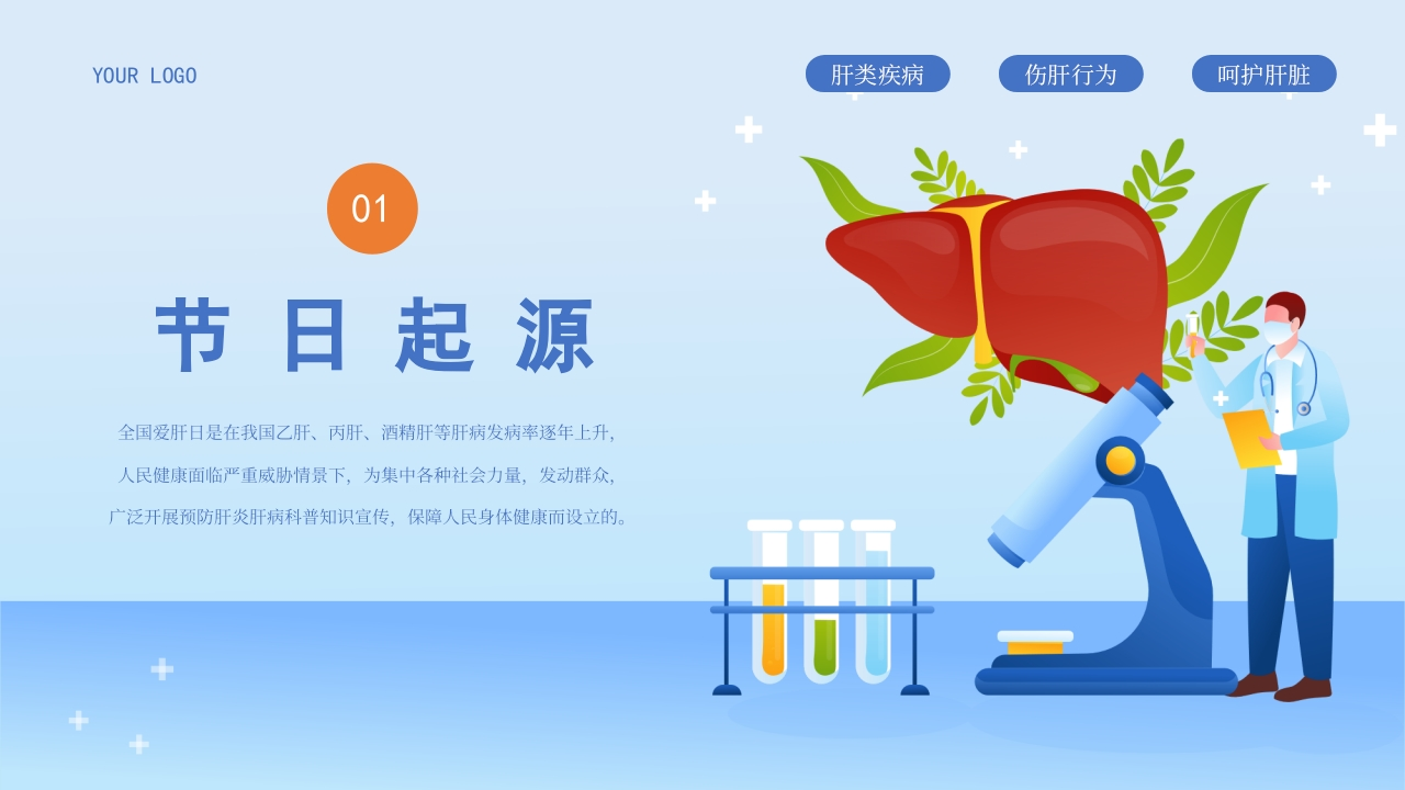 YOUR LOGO肝类疾病伤肝行为呵护肝脏3.18 National Liver Day全国爱肝日全国爱肝日是在我国乙肝、丙肝、酒精肝等肝病发病率逐年上升,人民健康面临严重威胁情景下,为集中各种社会力量,发动群众,广泛开展预防肝炎肝病科普知识宣传,保障人民身体健康而设立的。主讲:ABC时间:20XX
