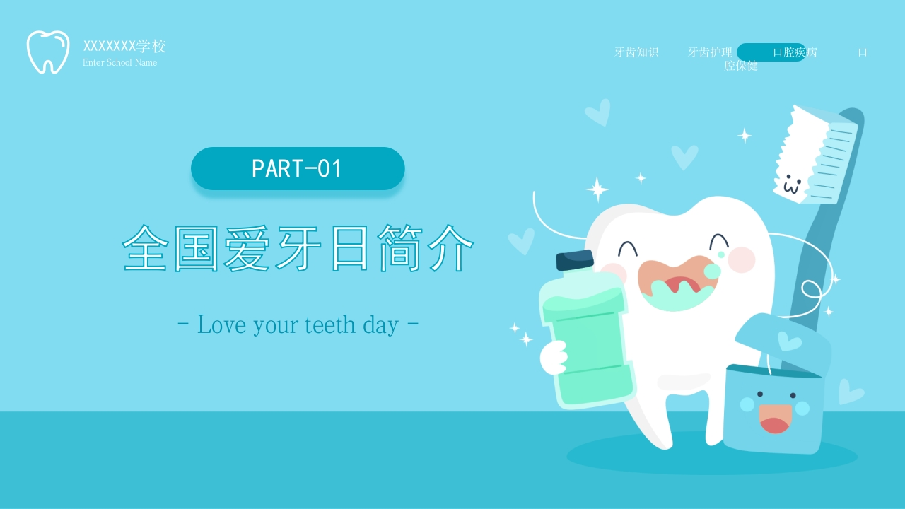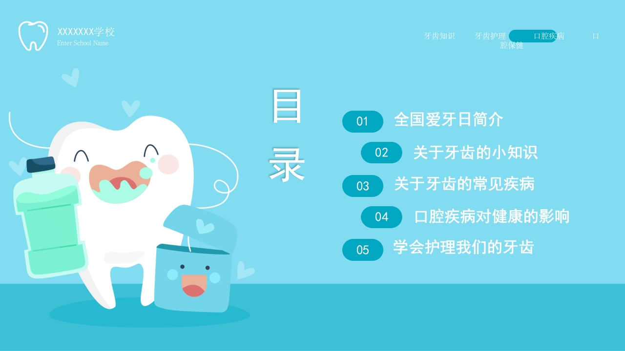 XXXXXXXX学校牙齿知识牙齿护理口腔疾病Enter School Name保健爱/护/牙/齿从/小/做/起口腔健康全身健康护牙健齿少年强健康中国民族兴中小学全国爱牙日主题班会