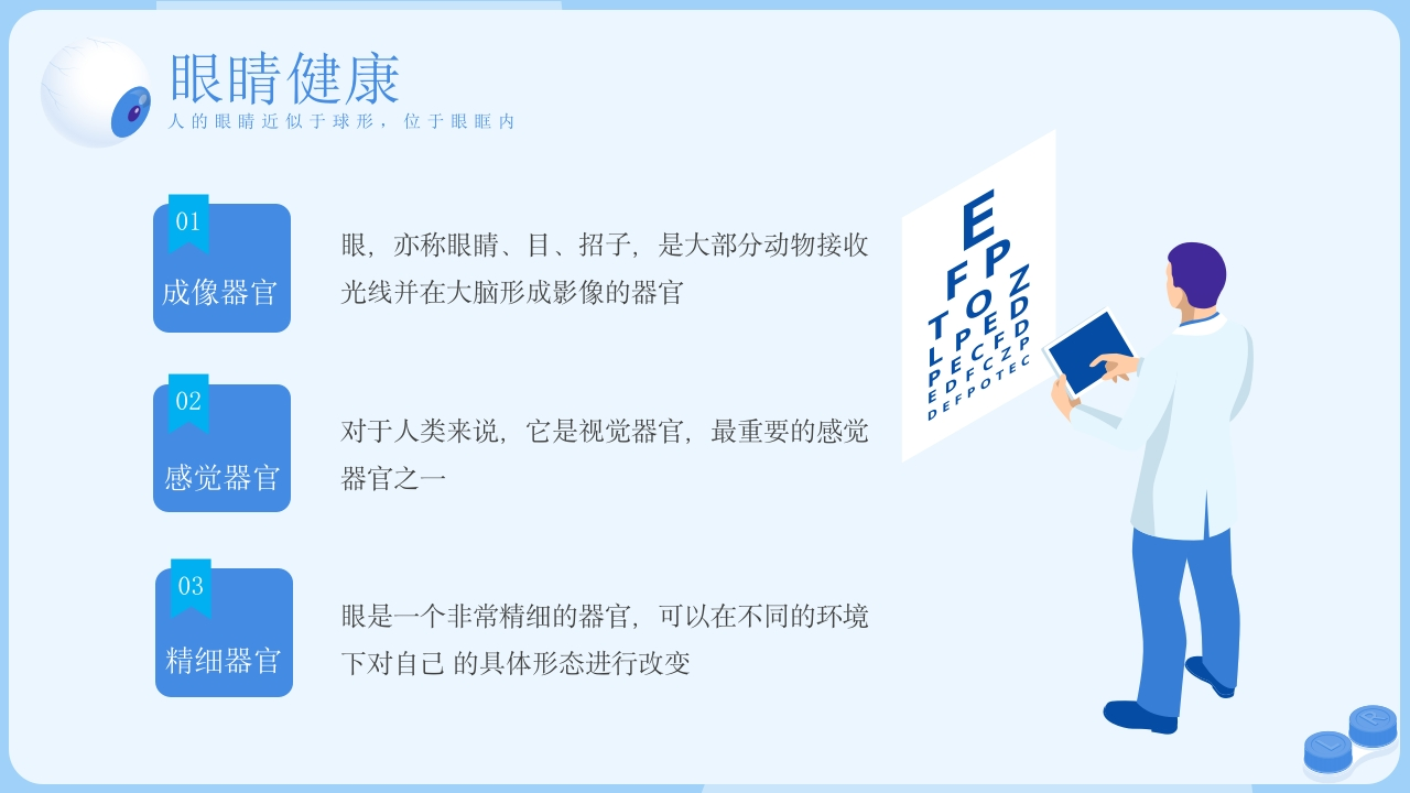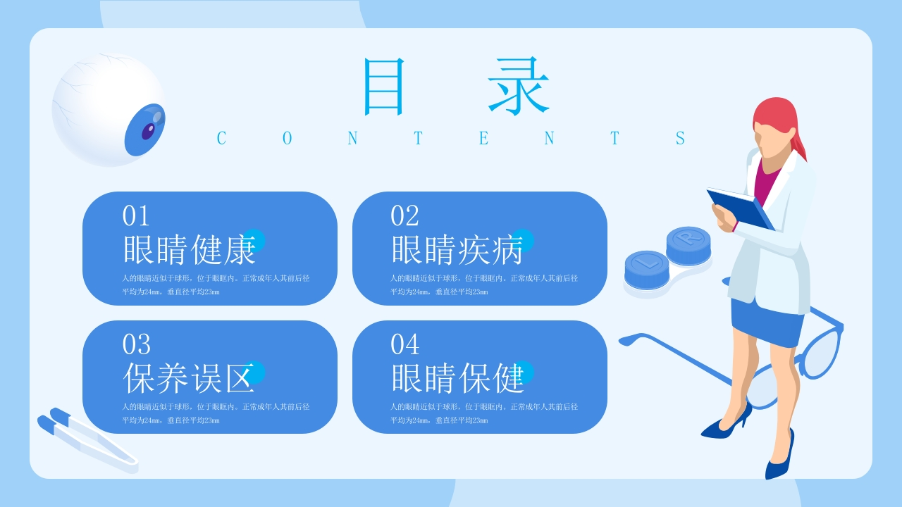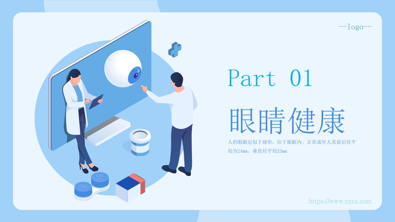 --DOCER WPS2X眼睛健康教育正确的保护方式才会让你的眼睛更健康人的眼睛近似于球形,位于眼眶内。正常成年人其前后径平均为24mm,垂直径平均23mm汇报人:ABC部门:XX团队https://www.xxxx.com