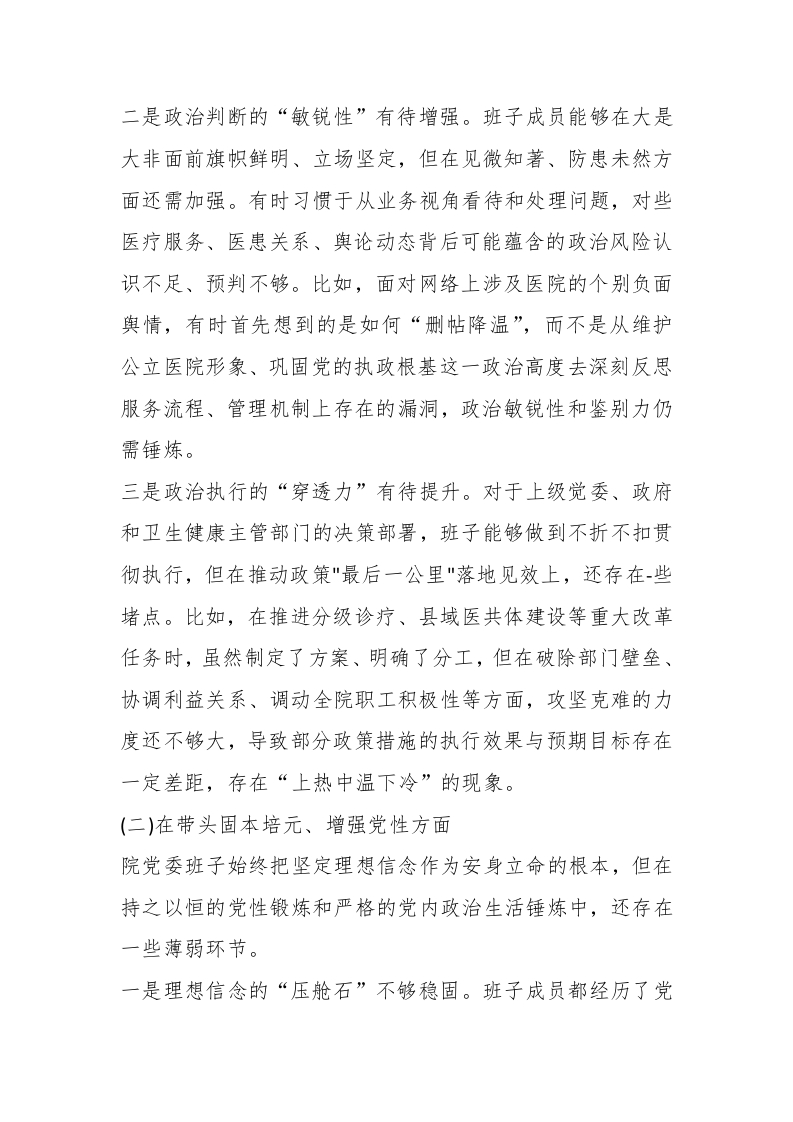 2025年度医院党委领导班子民主生活会“五个带头”对照检查材料范文根据县委关于开好2025年度民主生活会的统一部署和要求,县医院党委领导班子紧扣本次民主生活会主题,在扎实开展会前学习研讨、广泛征求意见建议、深入开展谈心谈话的基础上,全面对照“五个带头"方面内容,紧密联系医院改革发展和班子成员思想、工作、生活、作风实际,深入查摆突出问题,深刻剖析问题根源,明确了下步努力方向和整改措施。现将对照检查情况报告如下:一、存在的主要问题(一)在带头强化政治忠诚、提高政治能力方面院党委班子始终坚持把党的政治建设摆在首位,深刻领悟“两个确立”的决定性意义,坚决做到“两个维护”,但在对标对表更高标准、更严要求下,仍存在一些差距和不足。一是理论学习的“转化率”有待提高。班子成员能够带头坚持读原著、学原文、悟原理,但有时存在“为了学习而学习”的现象,在将理论学习成果创造性地转化为推动医院高质量发展的具体思路和务实举措上还不够。比如,在学习领会“新质生产力"等新理论新思想时,满足于"知道了”"了解了",如何结合医院实际,在前沿医疗技术引进、智慧医院建设、医学科研创新等方面培育医院的“新质生产力”,思考不深、谋划不多、行动不快,存在一定的"学用脱节"现象。
