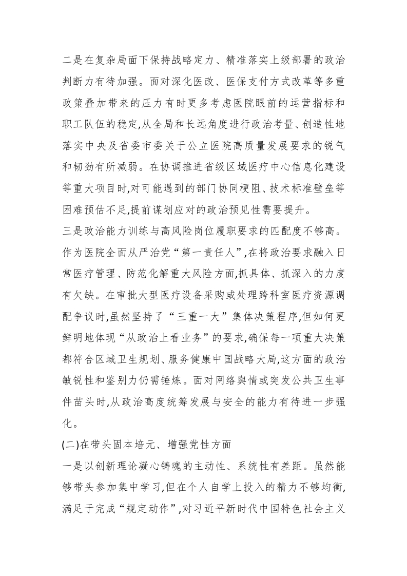 XX市人民医院党委书记2025年度民主生活会个人对照检查材料(五个带头)2根据本次民主生活会主题要求,本人紧扣深入学习贯彻习近平新时代中国特色社会主义思想,全面贯彻落实党的二十届三中、四中全会精神,锲而不舍落实中央八项规定精神、推进作风建设常态化长效化等核心要求,在深入开展中央八项规定精神专题学习教育、广泛征求意见建议、坦诚进行谈心谈话的基础上,严格对照会议明确的五个方面重点内容,紧密结合个人思想、职责和工作实际,进行了深刻反思和自我剖析。现将对照检查情况报告如下。一、存在的主要问题(一)在带头强化政治忠诚、提高政治能力方面一是理论武装向实践转化的深度和效度仍有不足。虽然能够坚持落实党委理论学习中心组学习制度和“第一议题”制度,及时组织学习党的创新理论、党的二十大及历次全会精神但在运用其立场观点方法破解医院改革发展深层次矛盾上,思考谋划的前瞻性和系统性不够强。例如,在推动医院从规模扩张向内涵式高质量发展转型过程中,对于如何将“两个维护”的政治要求精准贯穿于学科布局、人才引育等长远决策,使其与建设武陵山区医疗中心的战略目标更紧密融合,尚缺乏一整套成熟清晰的实践路径和评估标准,学习成果转化为治理效能的“最后一公里”有待进一步打通。