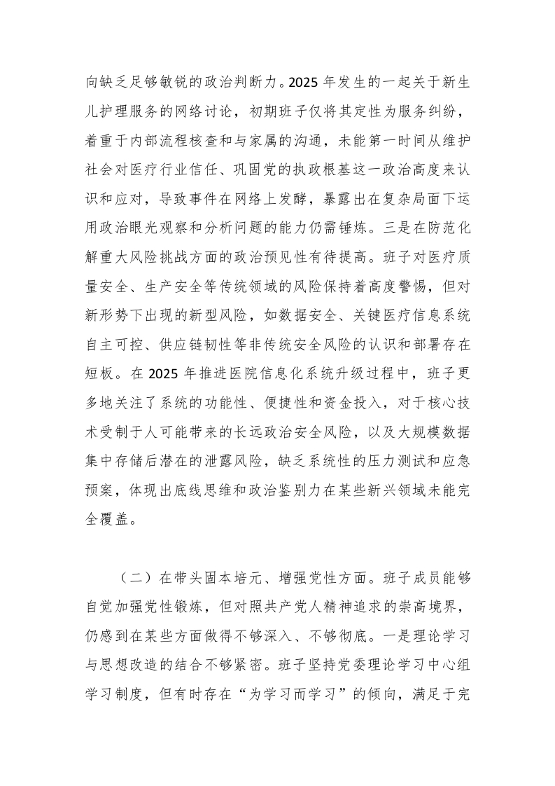 领导班子2025年民主生活会对照检查材料(医院)根据市委和市卫生健康委党组的统一部署,x市妇幼保健院领导班子紧扣本次民主生活会主题,在深入学习研讨、广泛征求意见、开展谈心谈话的基础上,对照5个方面内容,深入查摆存在的突出问题,深刻剖析问题产生的根源,明确了今后的努力方向和整改措施。现将对照检查情况报告如下。一、存在的主要问题(一)在带头强化政治忠忠诚、提高政治能力方面。班子始终将政治建设摆在首位,但在对标对表更高标准和要求时,仍发现存在一些差距和不足。一是将宏观政策转化为具体实践的穿透力有待加强。班子能够及时学习领会党中央关于卫生健康工作的各项大政方针,但在推动政策与医院实际深度融合,特别是将其转化为一线科室可操作、可量化的具体工作方案时,存在一定的时滞和折扣。二是应对复杂舆情和意识形态挑战的政治敏锐性不够强。面对新媒体环境下涉医舆情频发的态势,班子虽然建立了舆情监测和应对机制,但在处理具体问题时,有时更多地从业务管理和法律合规角度出发,对事件背后可能蕴含的意识形态风险和社会情绪动