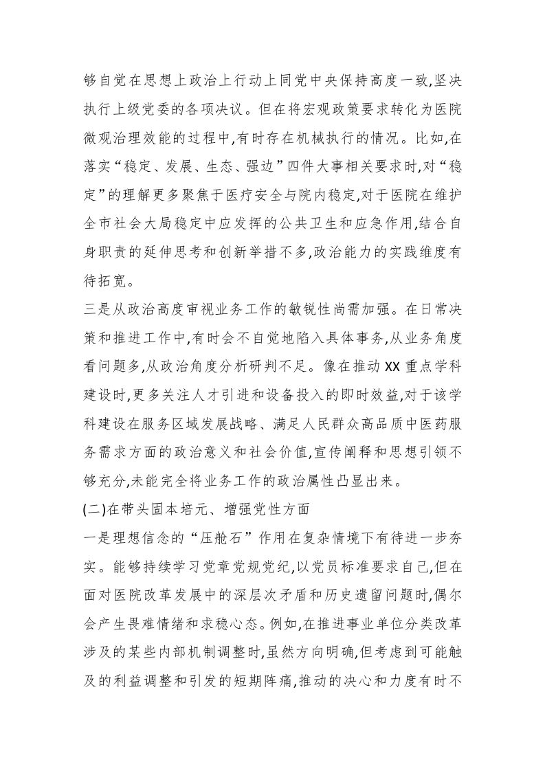 XX市中医医院党委书记2025年度民主生活会个人对照检查材料(精品)根据本次民主生活会主题要求,本人紧扣深入学习贯彻习近平新时代中国特色社会主义思想,全面贯彻落实党的二十届三中、四中全会精神,深入贯彻落实习近平总书记重要讲话和重要指示批示精神,锲而不舍落实中央八项规定精神,推进作风建设常态化长效化等核心要求,在深入学习研讨、广泛征求意见、坦诚谈心谈话的基础上,对照五个方面重点内容,紧密联系个人思想、职责和工作实际,进行了深刻的自我剖析和反思。现将个人对照检查情况报告如下。一、存在的主要问题(一)在带头强化政治忠诚、提高政治能力方面一是理论武装的系统性和转化度仍有欠缺。虽然能够坚持参加党委理论学习中心组学习,第一时间组织传达学习党的二十届四中全会等重要会议精神,但在结合医院实际进行系统性、前瞻性研讨方面深度不够。例如,在组织领导班子学习中央关于促进中医药传承创新发展的重大决策部署时,有时满足于会议传达和文件学习,对于如何将这些顶层设计精准转化为医院“十四五”收官和“十五五”谋划的具体路径,思考的主动性和穿透力不足,导致部分战略机遇抓得不够紧、不够实。二是政治判断力、领悟力、执行力的贯通落实存在温差。能
