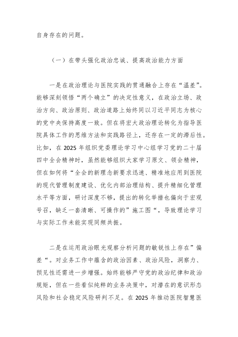 医院党委书记2025年度民主生活会个人对照检查发言材料根据市委和市卫健委党工委关于召开2025年度民主生活会的统一部署,本人在会前紧紧围绕本次民主生活会主题,系统重温了习近平新时代中国特色社会主义思想的科学体系和核心要义,深入学习了党的二十届三中、四中全会精神,特别是习近平总书记关于党的建设的重要思想和关于严肃党内政治生活的重要论述。同时,我还深度研读了新修订的《中国共产党纪律处分条例。在此基础上,我与班子成员逐一开展了深入的谈心谈话,并广泛征求了分管领域、基层党支部和部分党员干部群众的意见建议。通过以上准备工作,我进一步深化了认识、统一了思想,也更加清醒地看到了自身在思想、政治、作风、能力、廉洁等方面存在的差距和不足。下面,我将本着对党忠诚、对事业负责的态度,进行深刻的自我剖析,恳请同志们批评指正。一、存在的主要问题对照本次民主生活会明确的五个方面重点内容,我坚持把自己摆进去、把职责摆进去、把工作摆进去,全面查摆了