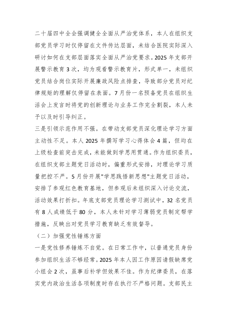 XX医院党支部组织委员、纪律委员2025年度组织生活会个人对照检查材料根据上级党组织关于召开2025年度组织生活会的部署要求,本人认真学习贯彻党的二十届四中全会精神,深入领会习近平新时代中国特色社会主义思想,紧密结合医院党支部组织委员、纪律委员岗位职责,对照六个方面深入查摆问题,剖析根源,明确整改方向。现将对照检查情况报告如下。一、存在的问题(一)学习贯彻党的创新理论方面一是理论武装不够深入。在组织支部党员学习党的二十届四中全会精神过程中,存在学深悟透不够的问题。2025年支部组织集中学习12次,本人作为组织委员负责制定学习计划,但对全会精神核心要义把握不准,学习内容安排存在泛泛而读现象。3月份组织学习时,仅安排了2小时读文件原文,未邀请专家深入解读,导致15名参学党员中有6人表示对全面深化改革的重要论述理解不深。在11月份支部学习笔记抽查中,发现3名党员学习记录仅有简单摘抄,本人作为组织委员未及时发现并纠正,反映出学习组织工作不细致不扎实。二是学用结合不够紧密。作为纪律委员,在将党的创新理论转化为指导纪律监督工作的具体实践中存在明显差距。党的