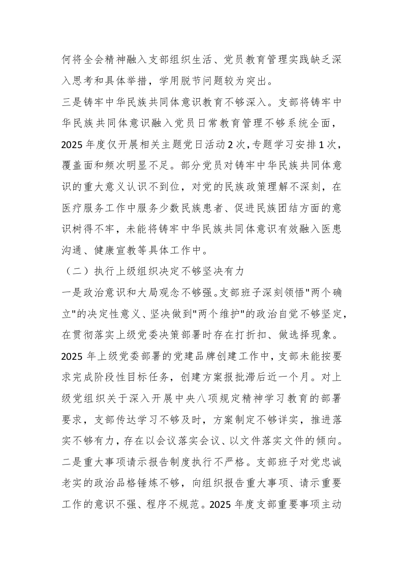 XX医院党支部2025年度组织生活会班子对照检查材料根据上级党组织关于召开2025年度组织生活会的部署要求,X医院党支部班子紧扣会议主题,深入学习党的二十届四中全会精神,扎实开展理论学习,广泛征求意见建议,深入查摆突出问题,深刻剖析问题根源,明确整改方向措施。现将支部班子对照检查情况报告如下。一、存在的问题(一)理论武装不够深入扎实一是理论学习的系统性不强。支部在组织党员读原著、学原文、悟原理方面缺乏整体规划和系统安排,全年开展集中理论学习次数偏少,部分党员对习近平新时代中国特色社会主义思想的精神实质和丰富内涵理解不透彻。学习方式以读文件、传达会议精神为主,"集中研讨+专题辅导+实践检验"的学习模式尚未有效建立,党员自学主动性欠缺,"学习强国”平台日均积分低于全院平均水平15分以上。二是理论联系实际不紧密。支部在推动理论学习成果转化为指导实践、推动工作的实际成效方面存在明显差距,学习习近平新时代中国特色社会主义思想与医院改革发展、医疗服务质量提升、医德医风建设等中心工作结合不够紧密。部分党员对党的二十届四中全会精神学习停留在通读层面,对如