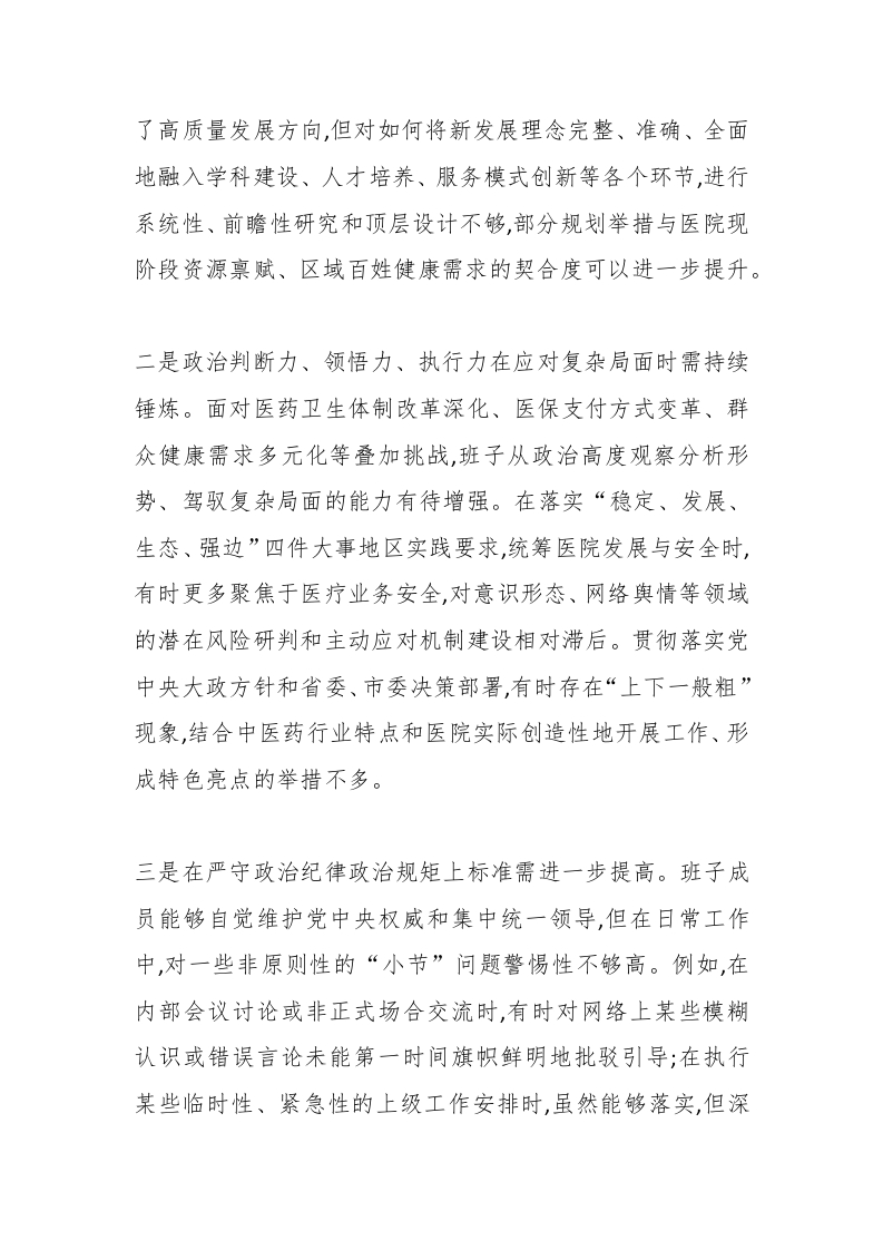 X市中医医院党委领导班子2025年度民主生活会对照检查材料(五个带头)(精品)根据上级党组织统一部署,院党委紧扣本次民主生活会主题,在深入学习研讨、广泛征求意见、坦诚谈心谈话基础上,对照五个方面重点内容,全面查摆问题、深刻剖析根源、明确整改方向。现将班子对照检查情况报告如下。一、存在的主要问题班子坚持问题导向,紧密联系医院改革发展实际和班子成员个人思想、职责、工作,深入查摆突出问题。(一)带头强化政治忠诚、提高政治能力方面一是理论武装与医院发展实践结合深度有待加强。学习领会习近平新时代中国特色社会主义思想,特别是关于卫生健康、中医药事业的重要论述和指示批示精神,在体系把握、融会贯通上尚有差距,运用党的创新理论指导医院破解深层次矛盾、谋划长远战略的穿透力不足。例如,在制定医院“十五五”发展规划和迎接三级甲等中医医院评审工作方案时,虽然明确