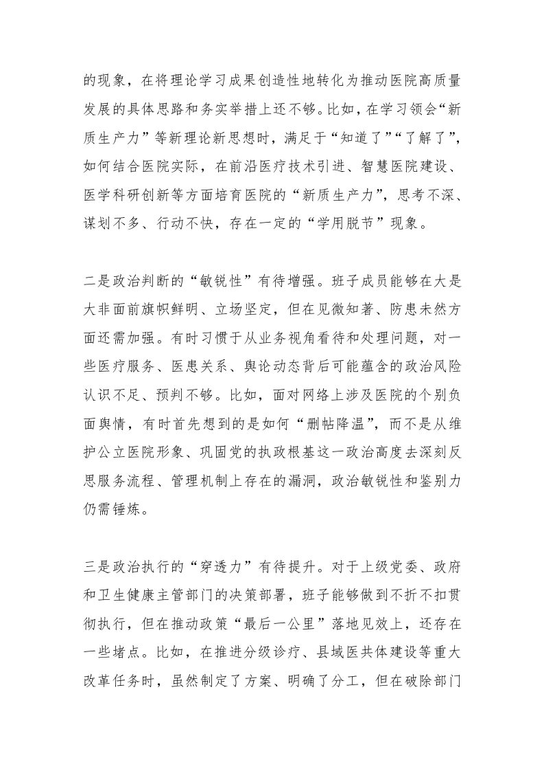 医院党委领导班子2025年度民主生活会对照检查材料根据县委关于开好2025年度民主生活会的统一部署和要求,县医院党委领导班子紧扣本次民主生活会主题,在扎实开展会前学习研讨、广泛征求意见建议、深入开展谈心谈话的基础上,全面对照“五个带头”方面内容,紧密联系医院改革发展和班子成员思想、工作、生活、作风实际,深入查摆突出问题,深刻剖析问题根源,明确了下步努力方向和整改措施。现将对照检查情况报告如下:一、存在的主要问题(一)在带头强化政治忠诚、提高政治能力方面院党委班子始终坚持把党的政治建设摆在首位,深刻领悟“两个确立”的决定性意义,坚决做到“两个维护”,但在对标对表更高标准、更严要求下,仍存在一些差距和不足。一是理论学习的“转化率”有待提高。班子成员能够带头坚持读原著、学原文、悟原理,但有时存在“为了学习而学习”