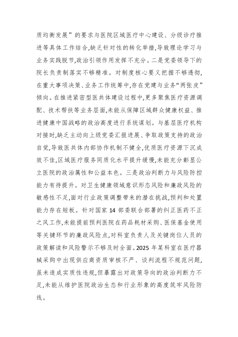 医院党委书记2025年度民主生活会对照检查材料(五个带头)根据市委关于召开2025年度民主生活会的统一部署,我紧扣会议主题,会前系统学习了习近平新时代中国特色社会主义思想,深入研读党的二十届三中、四中全会精神及习近平总书记关于卫生健康工作的重要论述,认真学习了新修订的《中国共产党纪律处分条例》等党内法规,并通过与班子成员谈心谈话、广泛征求基层党支部、党员干部及群众意见建议,把自己摆进去、把职责摆进去、把工作摆进去,深入查摆问题、剖析根源,制定整改措施。现将对照检查情况报告如下,请同志们批评指正。一、存在的主要问题(一)带头强化政治忠诚、提高政治能力方面。始终坚定拥护“两个确立”、坚决做到“两个维护”,在政治立场、政治方向上同以习近平同志为核心的党中央保持高度一致,但在将政治要求转化为医院发展实效的能力上仍有欠缺。一是政治理论与实践融合存在“温差”。对习近平新时代中国特色社会主义思想的学习缺乏系统性钻研,特别是对习近平总书记关于卫生健康工作重要论述的理解停留在原文学习层面,未能深度转化为指导医院高质量发展的思维方法。例如,在组织党委理论学习中心组学习党的二十届四中全会精神时,仅完成原文传达和初步研讨,对如何将全会关于“推进公共服务优