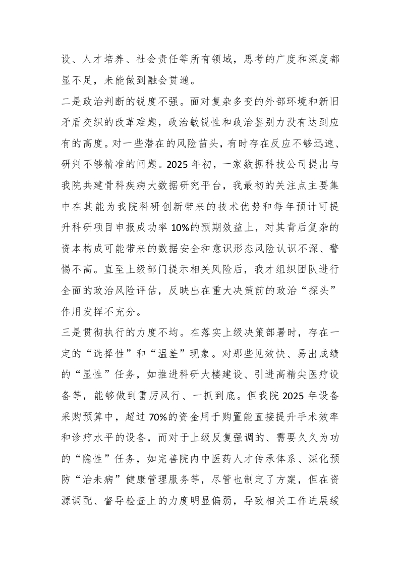 骨科医院党委书记2025年度民主生活会个人对照检查材料(带案例)根据上级党委关于召开2025年度民主生活会的统一部署,我紧扣“深入学习贯彻习近平新时代中国特色社会主义思想,全面贯彻落实党的二十届三中、四中全会精神…为实现‘十五五’良好开局奠定坚实基础”这一主题,在深入学习研讨和广泛征求意见的基础上,联系思想和工作实际,对照5个方面内容,深入查摆了自身存在的问题,深刻剖析了问题根源,明确了今后的努力方向和整改措施。现将个人对照检查情况报告如下。一、存在的问题(一)在带头强化政治忠诚、提高政治能力方面一是理论武装的深度不够。尽管能够坚持参加党委理论学习中心组的每一次集体学习,但对习近平新时代中国特色社会主义思想和党的二十届三中、四中全会精神的钻研缺乏“挤”和“钻”的韧劲。学习过程中,对与医院高质量发展、公立医院改革等直接相关的内容学得比较透彻,而对其中蕴含的宏大理论体系、严密逻辑框架的系统性把握不深。例如,在2025年第三季度中心组学习会上,我围绕新发展理念如何指导医院打造“X区域中医骨伤诊疗中心”谈了具体举措,但对于如何将这一理念完整、准确、全面地贯穿到医院文化建
