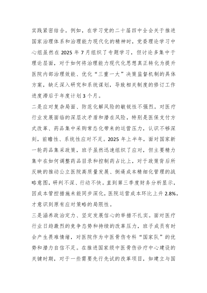 骨科医院2025年度民主生活会班子对照检查材料(带案例)根据上级党委关于召开2025年度民主生活会的统一部署,山东省X整骨医院党委班子紧扣“深入学习贯彻习近平新时代中国特色社会主义思想,全面贯彻落实党的二十届三中、四中全会精神,深入贯彻落实习近平总书记重要讲话和重要指示批示精神,以打攻坚战、持久战的决心和恒心,锲而不舍落实中央八项规定精神,推进作风建设常态化长效化,以优良作风凝心聚力、真抓干,聚焦高质量发展首要任务,扎实推进中国式现代化,为实现‘十五五’良好开局奠定坚实基础”这一主题,在深入学习研讨、广泛征求意见、坦诚谈心谈话的基础上,围绕“五个带头”要求,坚持把自己摆进去、把职责摆进去、把工作摆进去,深入查摆突出问题,深刻剖析思想根源,严肃开展批评和自我批评,明确了今后努力方向和整改措施。现将班子对照检查情况报告如下。一、存在的主要问题(一)在带头强化政治忠诚、提高政治能力方面一是贯彻落实上级决策部署的穿透力不彻底。班子在执行党中央决策部署及上级党委工作要求上态度是坚决的,但有时存在“为了落实而落实”的倾向,对标对表多、联系实际少,未能完全将上级精神与医院“十五五”规划开局之年的具体