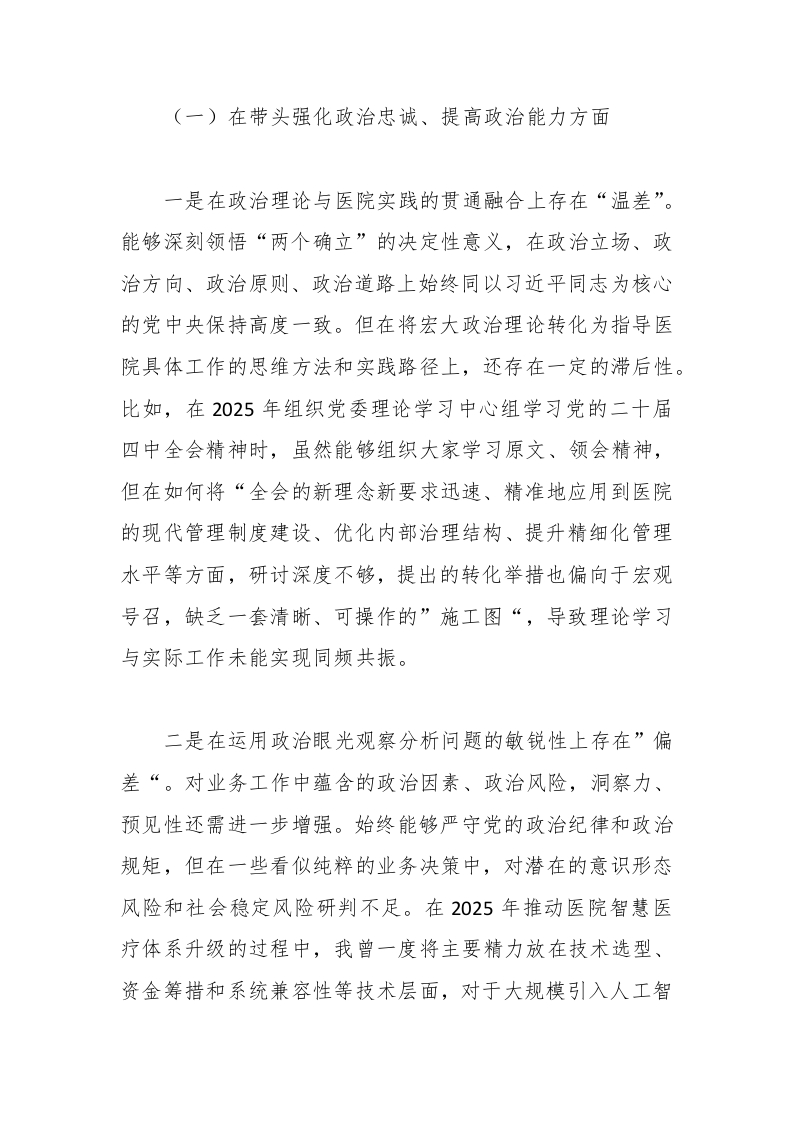 记2025年民主生活会对照检查材料(医院)根据市委和市卫健委党工委关于召开2025年度民主生活会的统一部署,本人在会前紧紧围绕本次民主生活会主题,系统重温了习近平新时代中国特色社会主义思想的科学体系和核心要义,深入学习了党的二十届三中、四中全会精神,特别是习近平总书记关于党的建设的重要思想和关于严肃党内政治生活的重要论述。同时,我还深度研读了新修订的《中国共产党纪律处分条例。在此基础上,我与班子成员逐一开展了深入的谈心谈话,并广泛征求了分管领域、基层党支部和部分党员干部群众的意见建议。通过以上准备工作,我进一步深化了认识、统一了思想,也更加清醒地看到了自身在思想、政治、作风、能力、廉洁等方面存在的差距和不足。下面,我将本着对党忠诚、对事业负责的态度,进行深刻的自我剖析,恳请同志们批评指正。一、存在的主要问题对照本次民主生活会明确的五个方面重点内容,我坚持把自己摆进去、把职责摆进去、把工作摆进去,全面查摆了自身存在的问题。