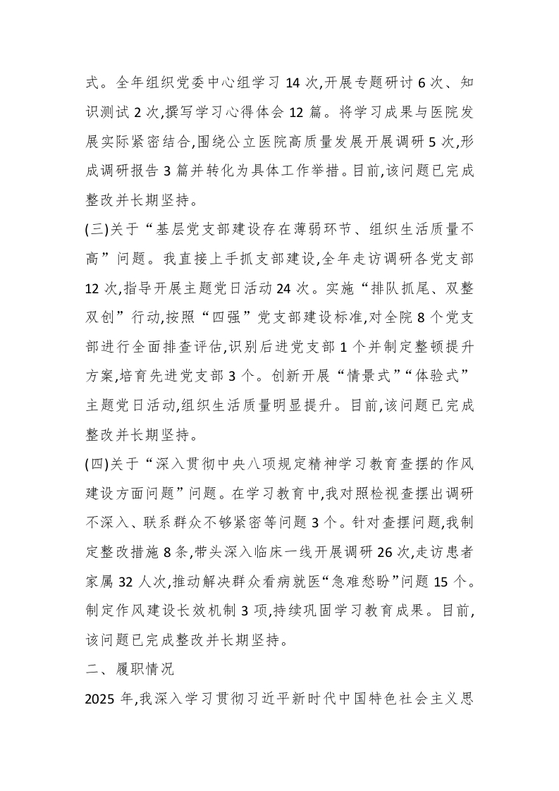 医院党委书记2025年度抓基层党建工作述职报告(精品)各位领导、同志们:按照县(市/区)委组织部关于开展2025年度基层党组织书记抓党建工作述职评议考核的通知要求,现将我履行医院党委书记抓基层党建工作第一责任人职责情况报告如下:一、问题整改情况针对2024年度党建工作成效考核、省委巡视反馈、上年度述职点评指出问题以及深入贯彻中央八项规定精神学习教育查摆问题,我坚持问题导向,逐项抓好整改落实。(一)关于“党委领导下的院长负责制运行机制不够健全”问题。我牵头修订完善了《医院党委会议事规则》《院长办公会议事规则》,明确党委讨论决定事项清单53项,规范党委会、院长办公会召开程序和议事规则。建立重大事项决策“双签”制度,全年召开党委会32次、院长办公会28次,实现党委把方向、管大局、作决策、促改革、保落实与院长在党委领导下依法依规独立负责开展工作有机统一。目前,该问题已完成整改并长期坚持。(二)关于“理论学习中心组学习质量不高、学用结合不紧密”问题。我坚持以上率下,带头制定个人学习计划,严格落实“第一议题”制度,创新实施“领学+研讨+测试”三位一体学习模