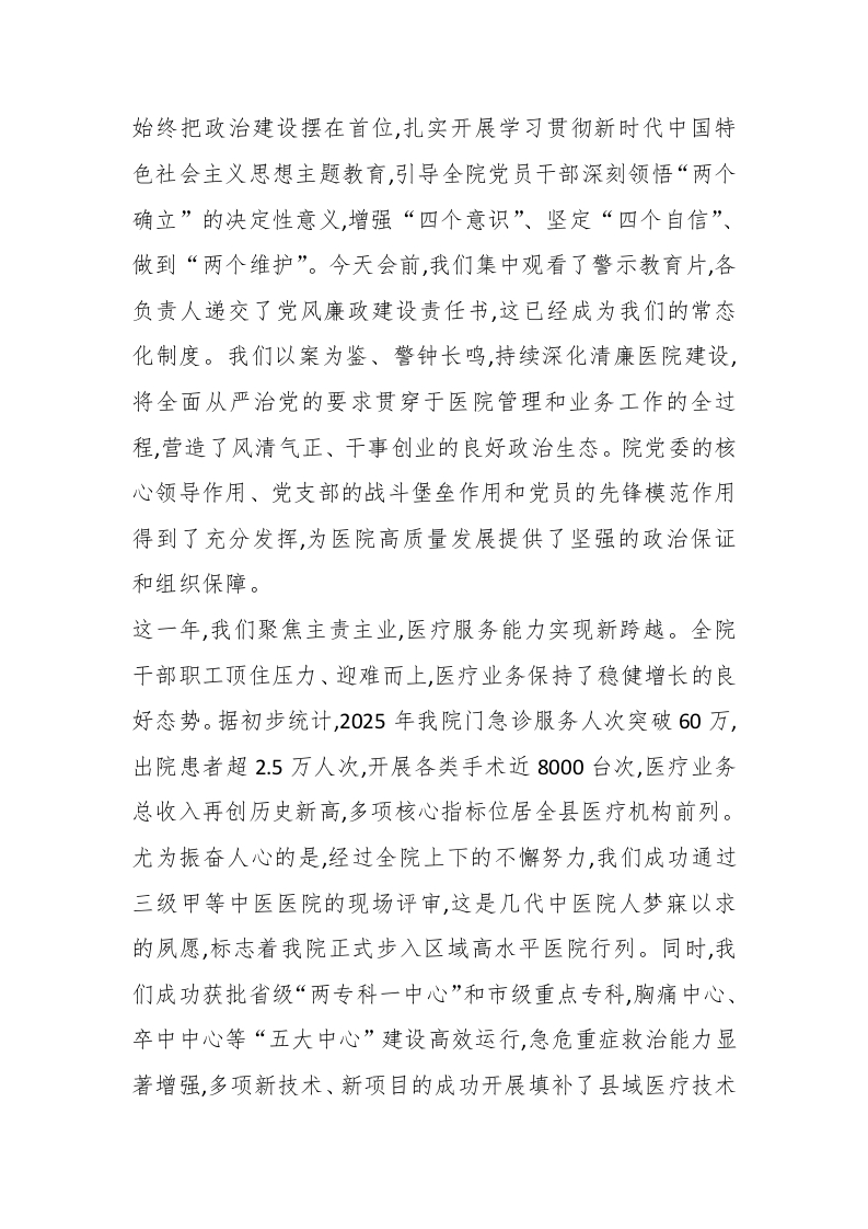 在X县中医医院2025年年度工作总结暨表扬大会上的讲话(精品)同志们,朋友们:大家晚上好!冬去春来,岁月更新。在这辞旧迎新的美好时刻,我们欢聚一堂,隆重召开X县中医医院2025年年度工作总结暨表扬大会。首先,我代表院党委,向在过去一年里辛勤耕耘、默默奉献的全体干部职工,致以最崇高的敬意和最诚挚的感谢!向今天受到表扬的先进集体和优秀个人,表示最热烈的祝贺!刚才,x院长作了全面详实、催人奋进的年度工作报告,系统总结了2025年我们共同走过的奋斗历程和取得的丰硕成果,并对2026年的重点工作进行了科学谋划和周密部署,我完全赞同。各位先进代表的发言,情真意切,朴实感人,展现了我们X县中医院人“敬佑生命、救死扶伤、甘于奉献、大爱无疆”的职业精神,值得我们每一个人学习。回首2025年,是医院发展史上极不平凡、具有里程碑意义的一年。面对复杂多变的外部环境和艰巨繁重的发展任务,全院上下在县委、县政府和上级主管部门的坚强领导下,坚持以高质量发展为主题,紧紧围绕年初确定的目标任务,凝心聚力、攻坚克难,各项事业都取得了令人瞩目的新成就,医院综合实力和社会影响力迈上了新台阶。这一年,我们坚持党建引领,发展的政治方向更加坚定。我们