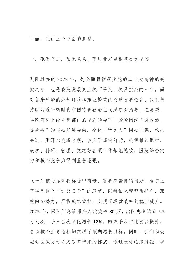 在县人民医院2026年工作暨党风廉政建设会议上的讲话同志们:大家好!冬去春来,万象更新。今天,我们怀着对过往的深刻总结和对未来的无限憧憬,在这里隆重召开*县人民医院2026年工作暨党风廉政建设会议。刚才,*同志宣读了2025年度的表彰决定,一批先进集体和先进个人受到了嘉奖。在此,我谨代表县卫健委党组和医院党委,向受到表彰的同志们表示热烈的祝贺!向在过去一年里,为医院发展辛勤付出、默默奉献的全体干部职工及家属们,致以最崇高的敬意和最诚挚的感谢!这次会议,既是一次回顾过去、总结经验的盘点会,也是一次分析形势、明确任务的部署会,更是一次鼓舞士气、团结奋进的动员会。主要任务是,深入学习贯彻党的二十大及二十届历次全会精神,全面总结我院2025年各项工作,深刻剖析当前面临的形势与挑战,系统部署2026年重点任务和党风廉政建设工作,动员全院上下进一步统一思想、凝聚共识、坚定信心,以永不懈怠的精神状态和一往无前的奋斗姿态,奋力开创医院高质量发展的新局面。