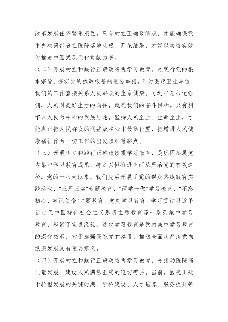 在X市第一人民医院树立和践行正确政绩观学习教育动员部署会上的讲话同志们:今天,我院召开树立和践行正确政绩观学习教育动员部署会,主要任务是深入学习贯彻习近平总书记关于树立和践行正确政绩观的重要论述和重要指示精神,全面落实党中央决策部署和省委、市委工作要求,对我院开展学习教育进行动员部署,引导全院党员干部职工牢固树立和践行正确政绩观,为推动医院高质量发展、更好保障人民群众健康提供坚强保障。一、深刻认识开展树立和践行正确政绩观学习教育的重大意义政绩观是党员干部从政、谋事、创业的“总开关"。在全党开展树立和践行正确政绩观学习教育,是以习近平同志为核心的党中央着眼党和国家事业发展全局作出的重大决策部署,是今年党的建设的重要任务。我们必须从政治和全局的高度,深刻领会其重大意义。(一)开展树立和践行正确政绩观学习教育,是贯彻落实党的二十届四中全会战略部署、确保基本实现社会主义现代化取得决定性进展的必然要求。党的二十届四中全会对推进中国式现代化作出全面部署,今年是"十五五"开局之年,各项