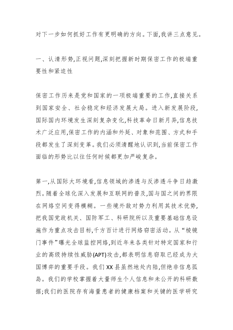 在x县学校、医院、企业保密工作专题会议上的讲话(精品)同志们:今天,我们在这里召开全县学校、医院、企业保密工作专题会议,主要任务是深入分析当前我们面临的保密工作新形势新挑战,通报近期发生的失泄密典型案例,学习贯彻上级有关保密工作的法规文件精神,研究部署下一阶段重点工作,进一步统一思想、压实责任,动员各单位、各部门共同努力,坚决筑牢新时代下的保密安全防线。刚才,我们共同学习了我市部分单位发生的失泄密和严重违规案例,以及《党政领导干部失泄密问题责任追究办法》和微信保密管理的相关文件精神。这些案例教训深刻,发人深省,为我们敲响了警钟。参加今天会议的,有教体、卫健、发改等行业主管部门的负责同志,也有我们县产业集聚区和各重点学校、医院、企业的管理人员,共计70余人。大家都是各自单位保密工作的具体组织者和责任人,肩负着守护国家秘密和重要工作信息安全的神圣使命。希望通过今天的会议,能让大家对保密工作的极端重要性有更清醒的认识,对潜在的风险隐患有更深刻的洞察,