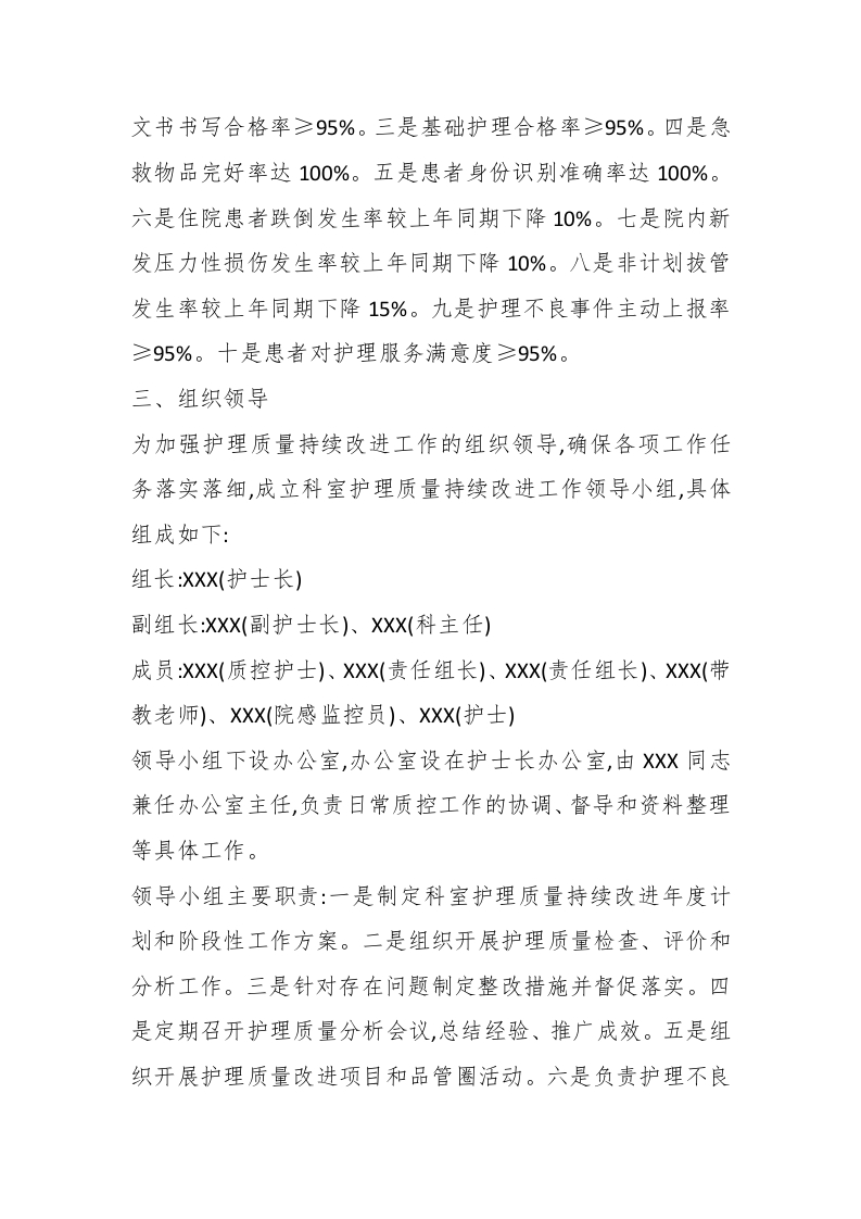 X医院儿科护理质量持续改进工作方案(精品)为深入贯彻落实《进一步改善护理服务行动计划》和医院护理工作部署要求,坚持以患者为中心的服务理念,持续提升护理服务质量和患者安全水平,建立健全护理质量持续改进长效机制,实现护理质量的科学化、规范化、精细化管理,切实保障患者安全,不断改善患者就医体验,结合科室实际,特制定本方案。一、指导思想坚持以习近平新时代中国特色社会主义思想为指导,聚焦人民群众日益增长的多样化护理服务需求,以"强基础、提质量、促发展"为主题,以保障患者安全为核心,以护理质量指标为导向,以PDCA循环管理为方法,以信息化手段为支撑,建立健全"护理部-护士长-质控员"三级质量管理网络,持续改进护理工作流程,不断提升护理服务质量和患者满意度,推动护理工作高质量发展。二、工作目标(一)总体目标。建立健全护理质量持续改进工作机制,形成"问题识别-原因分析-措施制定效果评价-持续改进"的闭环管理体系,确保护理安全,提升护理质量,改善患者体验,推动护理工作科学化、规范化、精细化发展。(二)具体目标。一是护理核心制度执行率达100%。二是护理