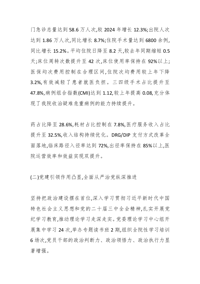 XX市中医医院2025年工作总结暨2026年工作计划(精品)各位同仁、同志们:岁序更替,华章日新。2025年,是我院发展历程中极不平凡的一年。一年来,在上级主管部门的正确领导下,在社会各界的关心支持下,全院上下坚持以习近平新时代中国特色社会主义思想为指导,深入贯彻党的二十届三中全会精神,紧紧围绕公立医院高质量发展总体部署,坚持党建引领、改革创新、内涵发展,各项事业取得了长足进步。今天,我们在此召开年终总结大会,回顾总结过去一年的工作,谋划部署来年的发展任务,激励全院干部职工以更加昂扬的斗志、更加饱满的热情,奋力谱写医院高质量发展新篇章。一、2025年工作回顾(一)业务指标稳步攀升,医疗服务能力持续增强2025年,全院上下紧扣医疗服务主责主业,攻坚克难、真抓实干,各项业务指标实现稳中有进、进中向好的良好态势。全年