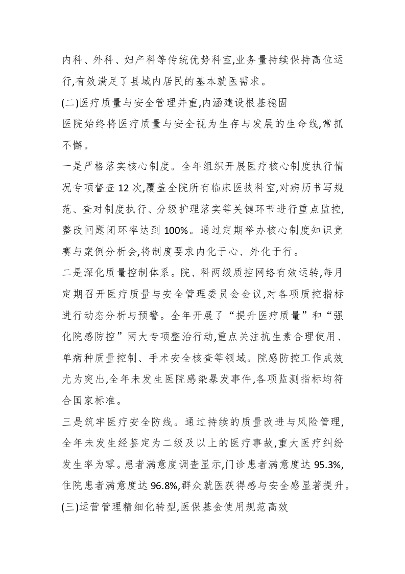 XX县人民医院2025年工作总结暨2026年工作计划2025年,在X县委、县政府的坚强领导与X上级卫生健康主管部门的精心指导下,X县人民医院坚持以人民健康为中心,以高质量发展为主题,全体干部职工凝心聚力、锐意进取,在医疗质量、运营管理、服务能力等方面取得了显著成效,为保障全县人民群众生命健康作出了积极贡献。为系统回顾过去一年的工作,科学谋划新一年的发展路径,特制定本总结与计划。一、2025年工作总结2025年是医院全面深化改革、提升内涵建设的关键之年。面对复杂多变的外部环境与日益增长的群众健康需求,我院紧扣年度工作目标,攻坚克难,各项工作稳步推进。(一)核心业务指标稳中有升,服务能力持续增强全院业务运行保持平稳向好的发展态势。据统计,2025年全年,医院总门急诊服务量达到18.5万人次,较去年同期增长5.2%;完成住院患者收治9800余人次,同比增长4.8%;开展各类手术3100余例,其中三、四级手术占比达到45%,较去年提升了3个百分点,标志着我院解决急危重症的能力得到进一步加强。病床使用率稳定在85%以上,平均住院日缩短至8.1天,各项核心业务指标均呈现健康、积极的增长趋势。尤其在