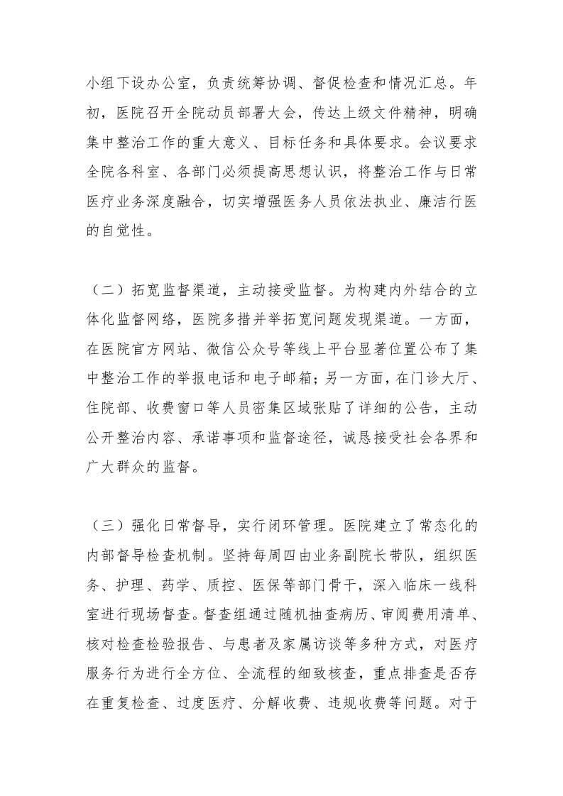 县医院2025年群众身边不正之风和腐败问题集中整治工作总结2025年,*县医院坚决贯彻落实国家、省、市、县关于开展群众身边不正之风和腐败问题集中整治工作的决策部署,坚持以人民健康为中心,聚焦医疗服务中的突出问题和薄弱环节,以高度的政治责任感和强烈的使命担当,扎实推进集中整治工作。本年度,我院重点围绕医保基金规范使用、医疗检查检验行为、医疗服务收费、惠民便民服务等关键领域,通过强化组织领导、深化自查自纠、完善制度体系、优化服务流程,取得了显著成效,现将全年工作总结如下。一、提高政治站位,强化组织领导与监督检查为确保集中整治工作有力、有序、有效开展,医院党委始终将此项工作作为年度核心任务来抓,坚持高位推动、压实责任,确保各项要求落到实处。(一)健全领导机制,明确责任分工。医院第一时间成立了由党委书记、院长任双组长,分管院领导任副组长,相关职能科室及临床科室负责人为成员的专项工作领导小组。领导