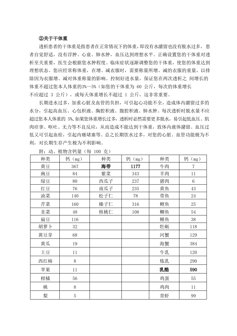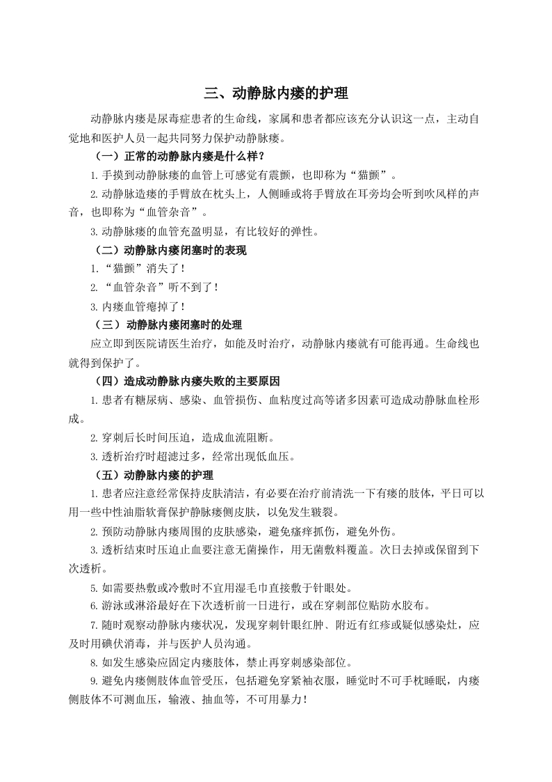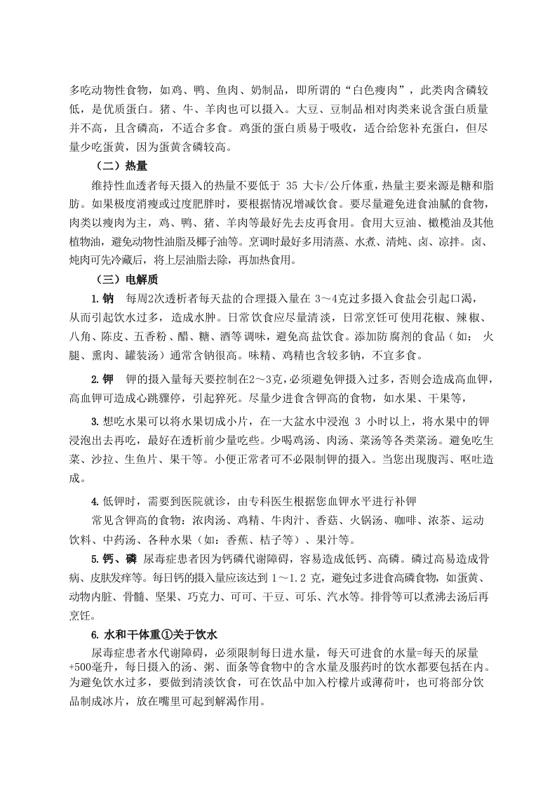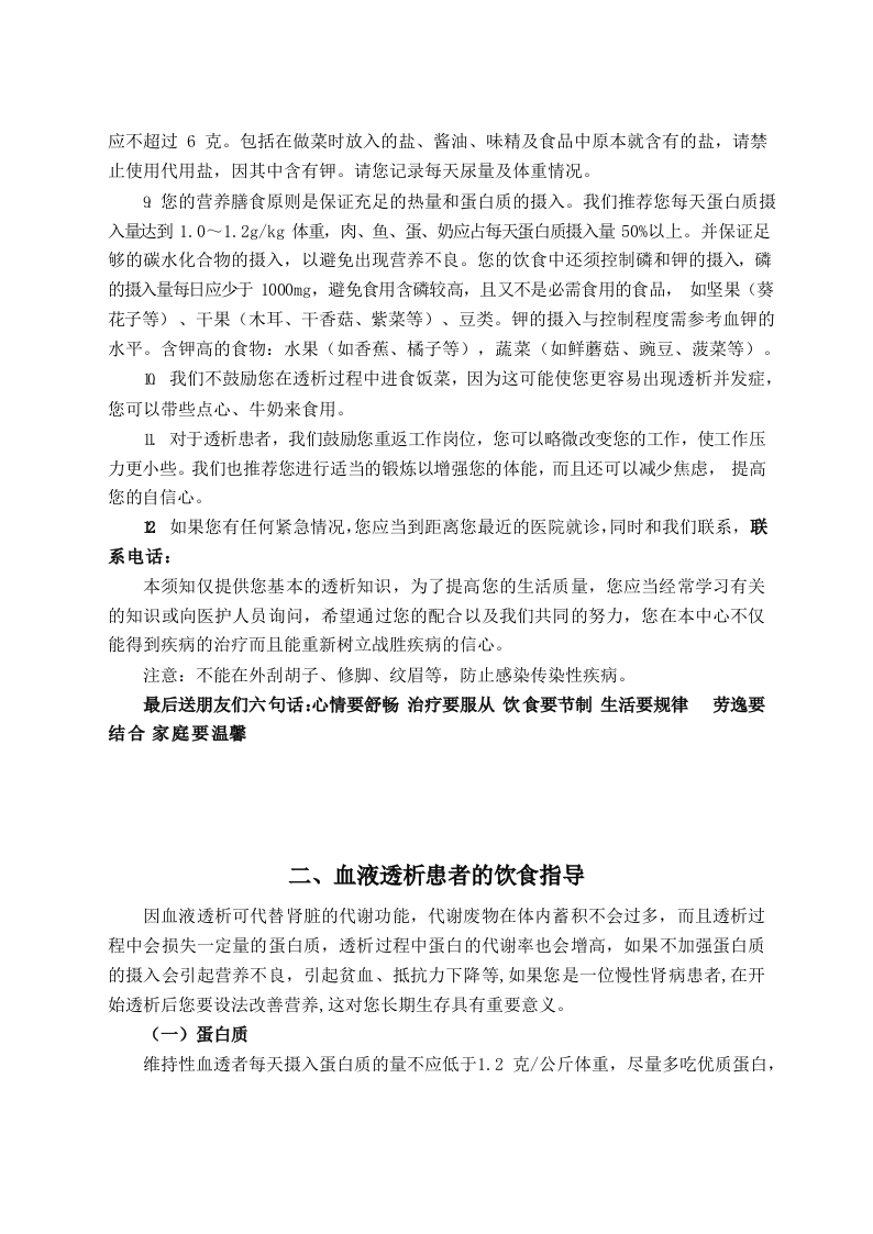 血液净化室健康教育一、血液透析患者须知1我们认为每个患者都应当得到尊重,同时也希望您应当在每次治疗中积极配合,以保证治疗的有效性,并有助于提高您的生活质量。2您有权在安静、整洁的环境中进行治疗,您也应该成为环境的保持者。希望您的家人不要在透析过程中进入治疗区,这样会增加您和其他患者的感染机会,分散工作人员的注意力。特殊情况,陪护须经医生、护士同意,方可进入。您的家属可以在专门的患者家属等候区等待。透析时患者不能携带锐器。3透析患者在往返途中可能会有意外发生,请家属陪送,治疗过程中可能发生病情变化,透析期间家属除交费外,请不要离开等候区,并与我们双向留下联系电话,当患者需要时,我们随时要进行联络。4请您服从我们为您安排的透析治疗时间,我们认为完整的完成每次透析是您治疗很重要的环节。由于特殊原因您需要临时改变您的透析治疗时间安排,请提前一天与我们联系并得到认可,如果我们因停电等特殊情况无法正常工作,将提前打电话通知您或您的家属。因此,互留联系电话尤为重要,请您配合。5请您不要在透析治疗室使用私人电器,因为可能会影响血透机的正常工作。6每次透析时,请自带卫生手纸、常用药(如降压药)、点心、水杯、绷带(有动静脉内瘘者)等常用物品,以备急需。7血管通路(包括中心静脉置管和动静脉内瘘)是您的生命线您应该像爱护自己生命一样爱护他们,对于中心静脉导管您应该保持局部清洁,尽量减少插管处肢体的弯曲,注意固定的缝线有无脱落,导管有无滑出,注意置管部位有无出血、局部分泌物和局部出现不适等,一旦发现异常应及时就诊。对于动静脉内瘘,您应注意保持内瘘侧肢体清洁、干燥。每次治疗前您应洗手(或用干手消毒剂消毒双手),治疗结束后穿刺部位压迫的压力要适当,压迫时间以短但不出血为宜。一般包扎20一30分钟后检查动、静脉穿刺部位无出血或渗血后松开包扎带(包扎时间长短因人而易)。每日监测瘘管有无震颤,发现异常立即报告医生。在其它医院、科室就医时应告知禁止在内瘘侧肢体输液、采血、测血压,瘘侧肢体应避免压迫,持重物,衣袖不可太紧。平时经常做握拳、放松或挤压橡皮圈,以增加血液循环,扩张内瘘血管。如果您透析间期有出血,请在本次透析时告知医务人员。8为让您有更好的生活质量,您应自觉的控制每日钠盐和液体的摄入,在两次透析期间,您的体重增长不应超过本人体重的3%~5%或每日体重增长不超过1公斤。要达到这个目标,您除了要控制水分的摄入外,更重要的是尽量少吃盐,每日盐的摄入