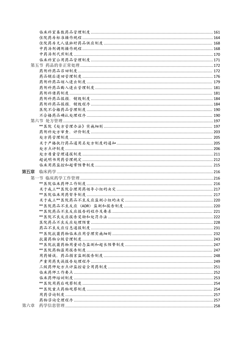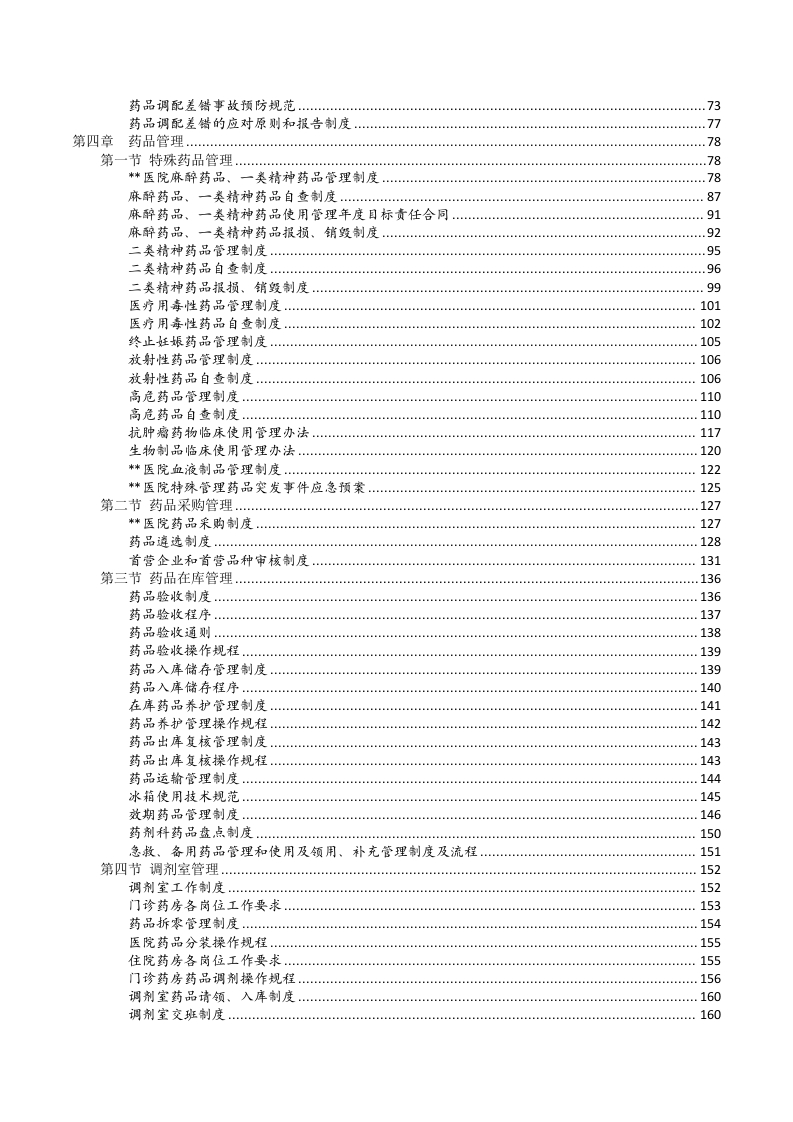 目录第一章组织结构与职责….1第一节医院药事管理委员会制度.1*医院药事管理与药物治疗学委员会幸程*医院新药中请审批制度..6医院药品沟汰原则…。7*医院新药中请审批程序….8第二节药剂科组织结构与职责018药剂科职责..19药剂科主任岗位职责.21药库职贡…23调剂室职责.24调剂室组长职责…。.27药剂科常规汇报、领导程序…27药剂料紧急情况下的报告和决策制度.28第三节药剂科工作制度.28药剂科统计工作制度…28药剂科计量工作制度.29药剂科业务学习制度29药剂科值班制度….30药剂科物资保管使用制度…。30药剂科保密制度….31对实地考察药品生产、经营企业的规定32第二章质量管理体系….33第一节质量管理组织与职责….33药品质量监督管理制度….33医院药品质量监督领导小组工作制度.34药剂科质量体系组织制度……34药剂科质量管理员岗位职责.38医院药学质量控制标准…38药剂科业务工作质量要求…。.39第二节质量管理体系评审…40药剂科质量管理体系评审制度……40药剂科顶量管理体系评审程序….41第三节质量持续改进….43药剂科质量持续改进制度….43药剂科质量持续改进工作会议制度.43第三章应急管理体系…50第一节突发事件的药事应急管理体系.52药剂科突发性紧急事件的药事管理应急体系….52药剂科突发性紧急事件管理制度.55第二节突发性公共卫生事件的药事应急管理体系58药剂科急性中毒应急预案.58常见海物急性中每临床表现.63第三节药事不良事件的应急管理体系….68药剂科重大药事质量事件报告与处理制度..68药剂科重大药事质量事件报告与处理程序.69差错事故管理制度.…72