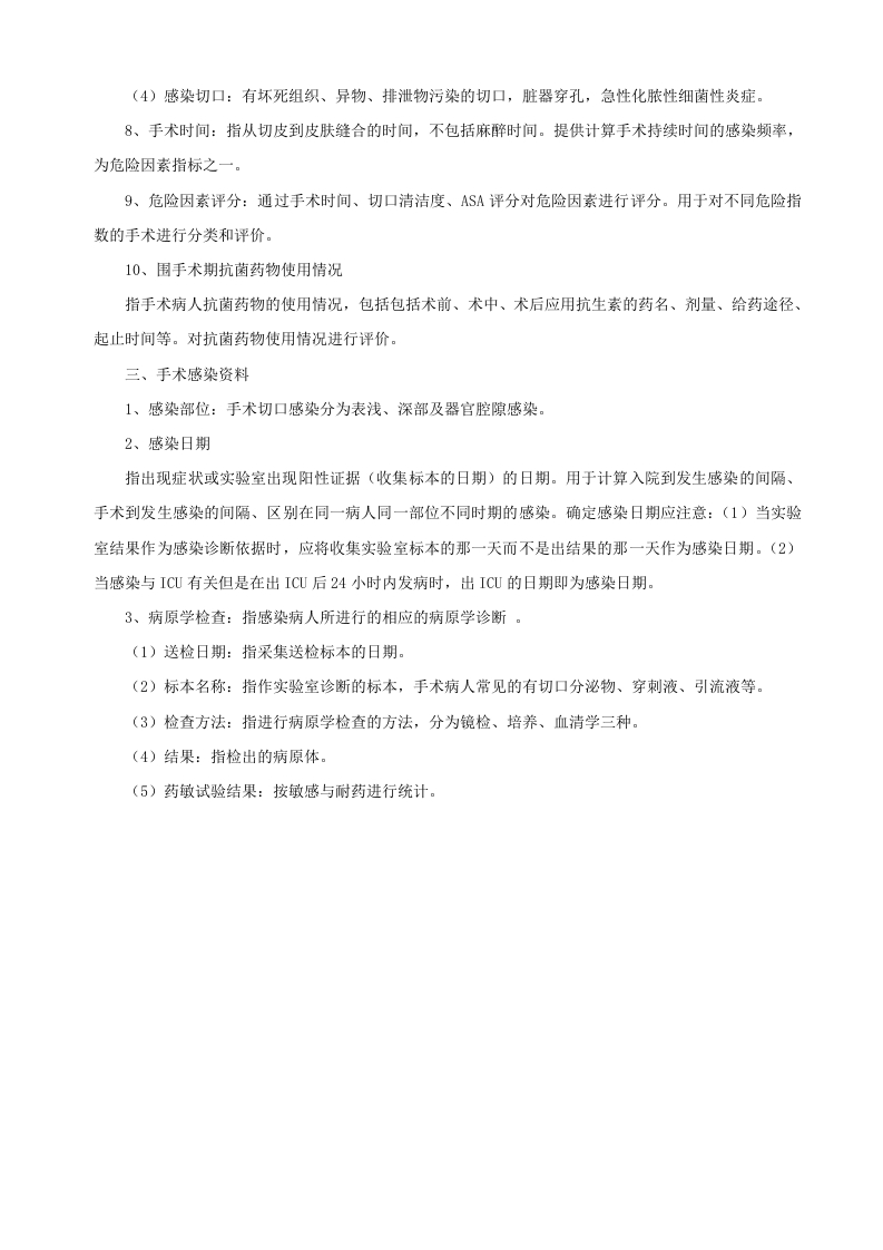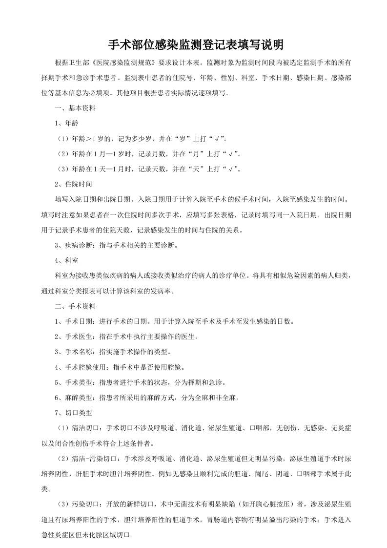 手术部位感染监测登记表科室/床号:医院感染:否口是口填表人:一、基本资料姓名住院号:性别/体重(kg):年龄:岁月天诊断:住院时间:年月日至年月日住院天数:联系电话:二、手术资料手术名称:手术类型:急诊口择期口手术时间:年月日时分至月日时分手术医生:手术腔镜使用:否口是口(植入物:否口是口麻醉方式:全麻口其他口(切口类型:清洁切口口清洁一污染切口口污染/感染切口口分级:IⅡⅢINV备皮(时间:地点方法术前外周BC计数:Hb:血糖:术中失血(ml)输血无口有口(ml)切口愈合等级:甲乙丙引流:无口有口(闭式否口是口:部位:开始时间:拔管时间:侵袭性操作:无口有口(保留导尿口:人工气道:经口插管口气管切开口:动静脉置管口:其他:危险因素评分:手术时间得分()+切口清洁度得分()+ASA得分()=()分围手术期抗菌药物使用情况:手术前用药手术中用药手术后用药>2h<2h未用用未用≤48h>48hs72h>72h用药情况具体情况:分析预防口治疗口预防口治疗口预防口治疗口评价合理口不合理口合理口不合理口合理口不合理口三、手术部位感染资料感染部位:表浅切口口深部切口口器宫腔隙口感染日期:年月日病原体培养否口是口(标本名称:送检时间:结果:附报告单:标本采集人:采集方法:规范口不规范口:现场查看口询问口)四、备注: