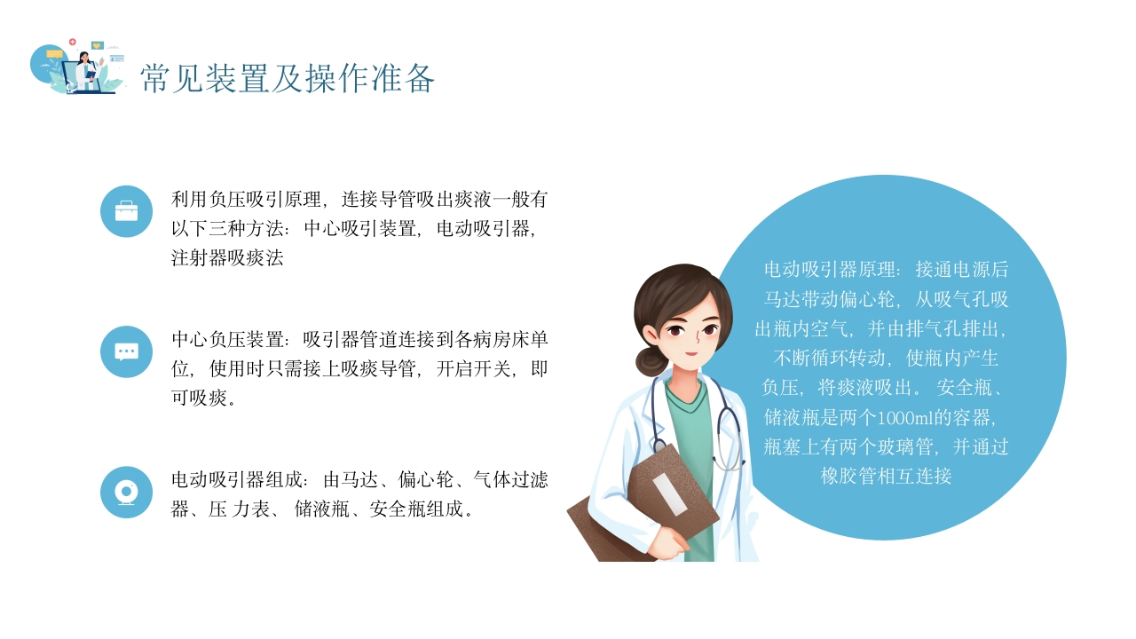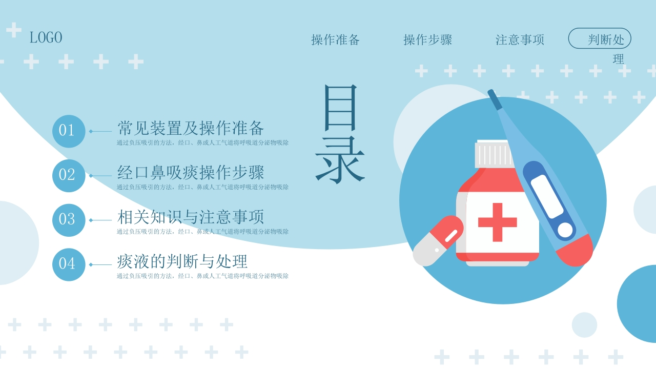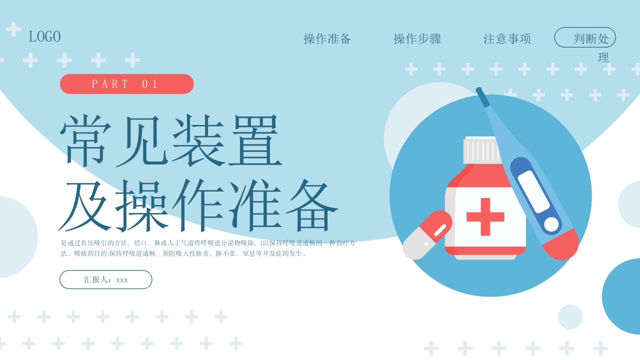LOGO操作准备操作步骤注意事项判断处理经口鼻吸痰技术培训吸痰医疗/医疗培训/课件培训是通过负压吸引的方法,经口、鼻或人工气道将呼吸道分泌物吸除,1以保持呼吸道通畅的一种治疗方法,吸痰的目的:保持呼吸道通畅,预防吸入性肺炎、肺不张、室息等并发症的发生,汇报人:xxX