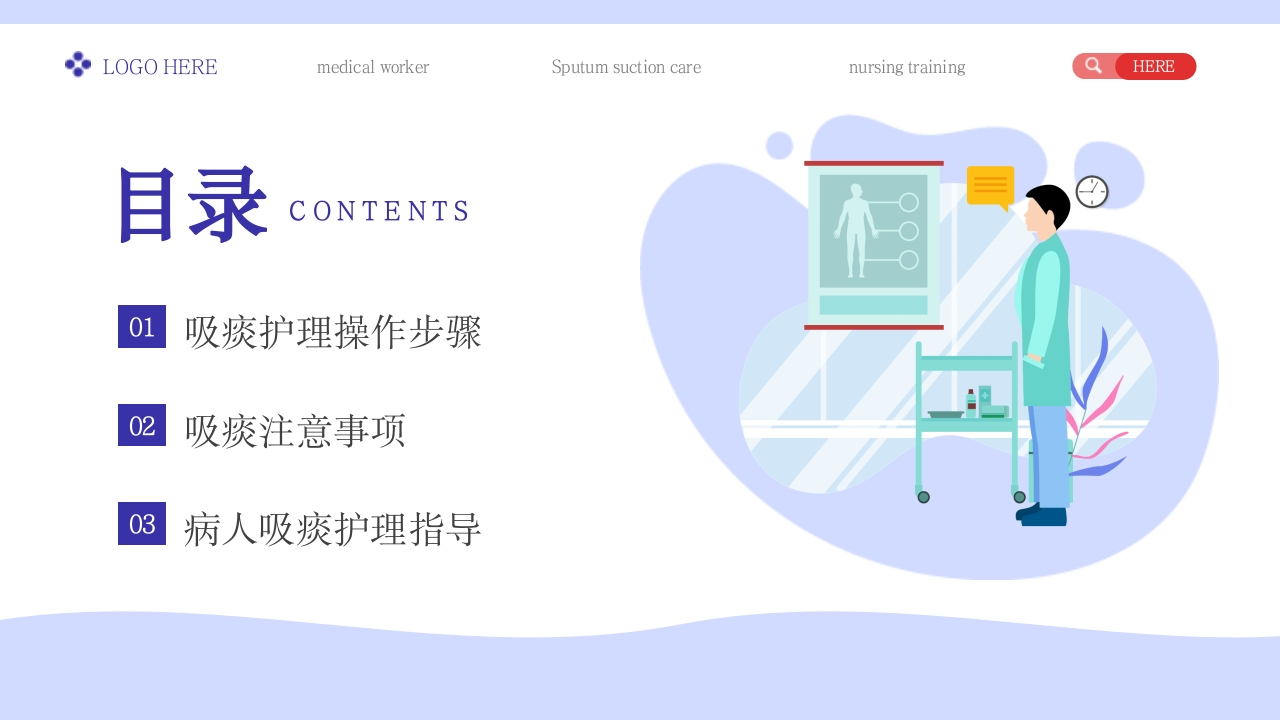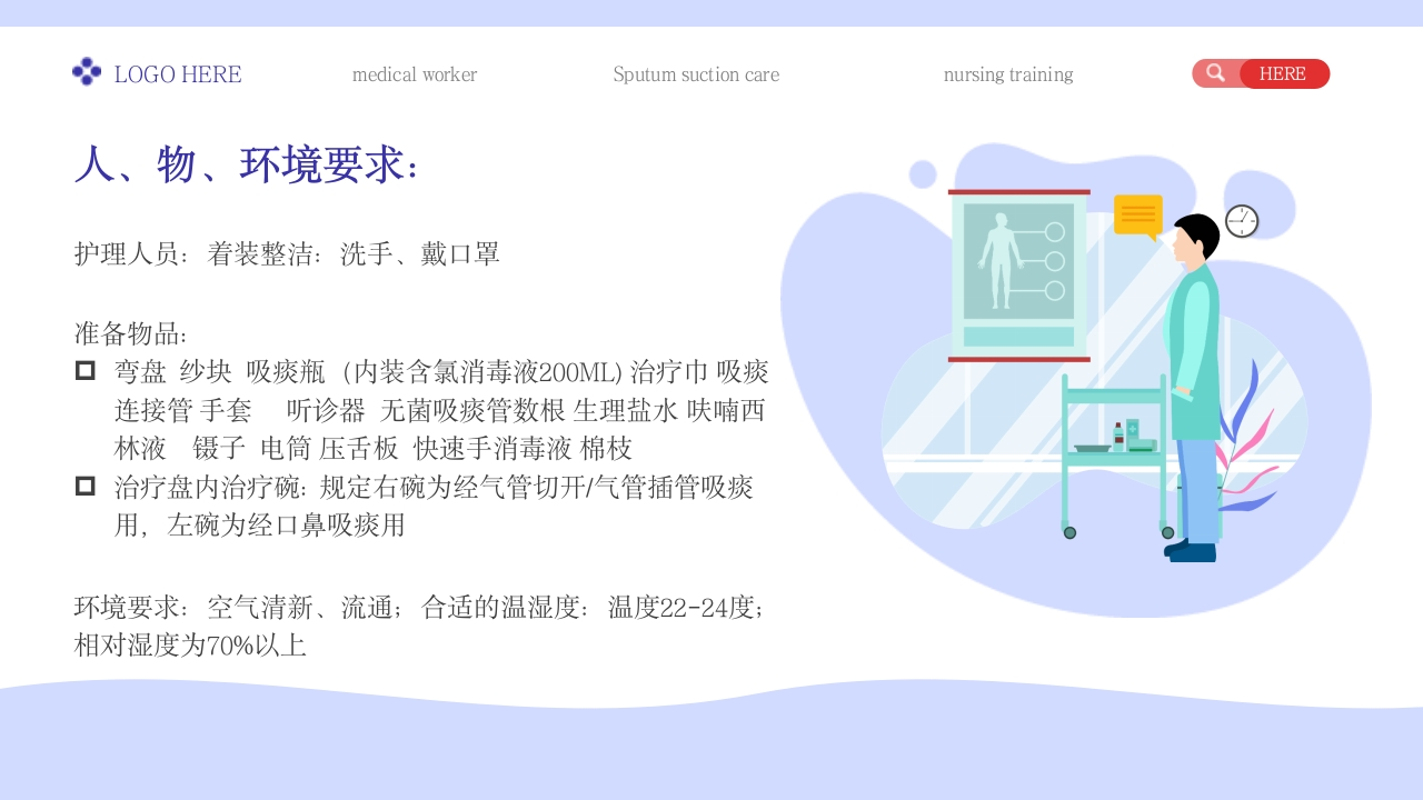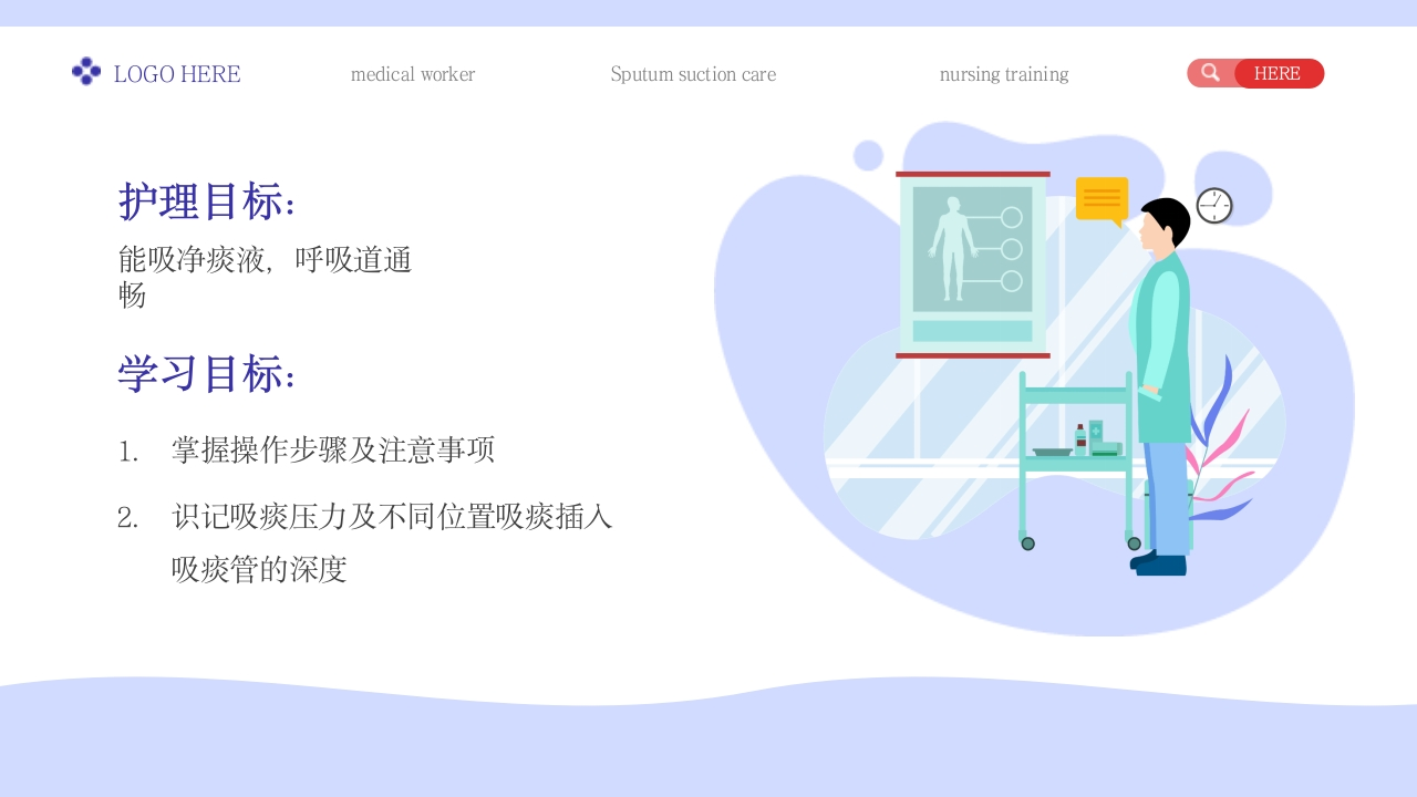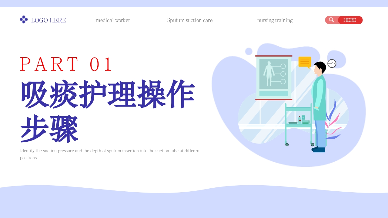 LOGO HEREmedical workerSputum suction carenursing trainingQHERENU R SE吸痰护理医务工作人员/吸痰护理培训/医务工作者Identify the suction pressure and the depth of sputum insertion into the suction tube at differentpositionsR汇报人:XXX时间:2023.06