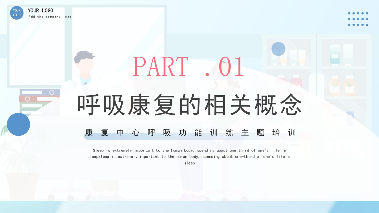 YOURYOUR LOGOLOGOAdd the company logo202X>呼吸康复培训康复中心呼吸功能训练主题培训Sleep is extremely important to the human body,spending about one-third ofone's life in sleepSleep is extremely important to主讲:某某某时间:202X-X