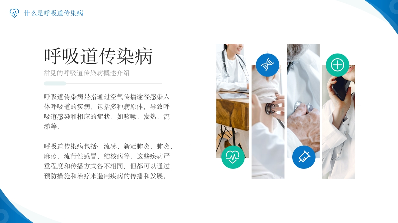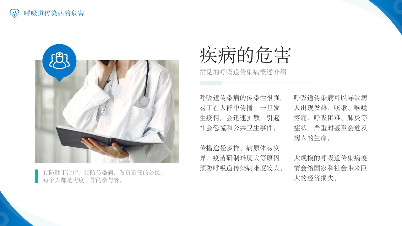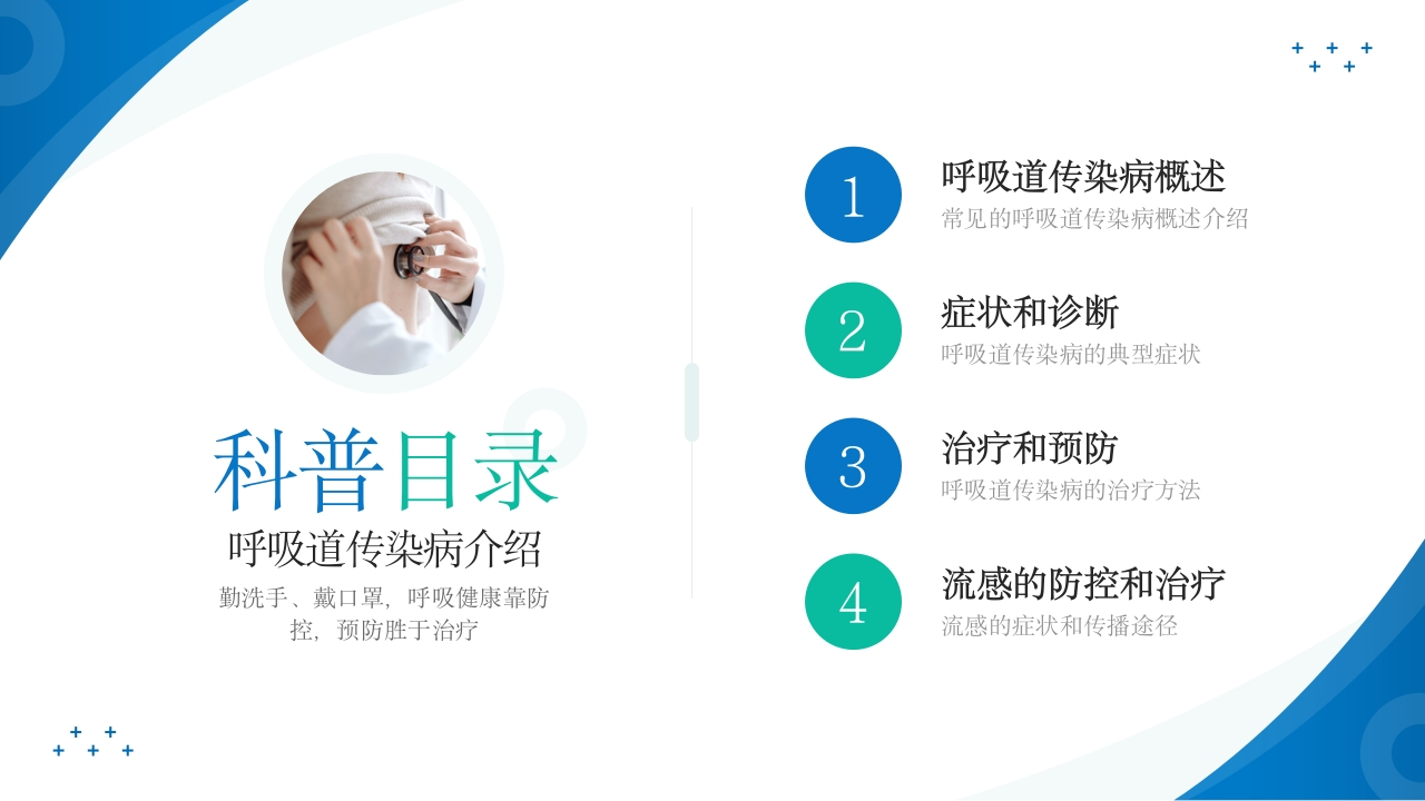 少YOURLOGO呼吸道传染病呼吸道传染病预防及治疗知识科普勤洗手、戴口罩,预防呼吸道疾病,空气传播须警惕】呼吸健康靠防控,预防胜于治疗,预防传染病,做负责任的公民。呼吸道传染病,共同抗击呼吸道传染病。XXXX科学防疫,共同抗击呼吸道传染病DqRESPIRATORY●infectious diseases