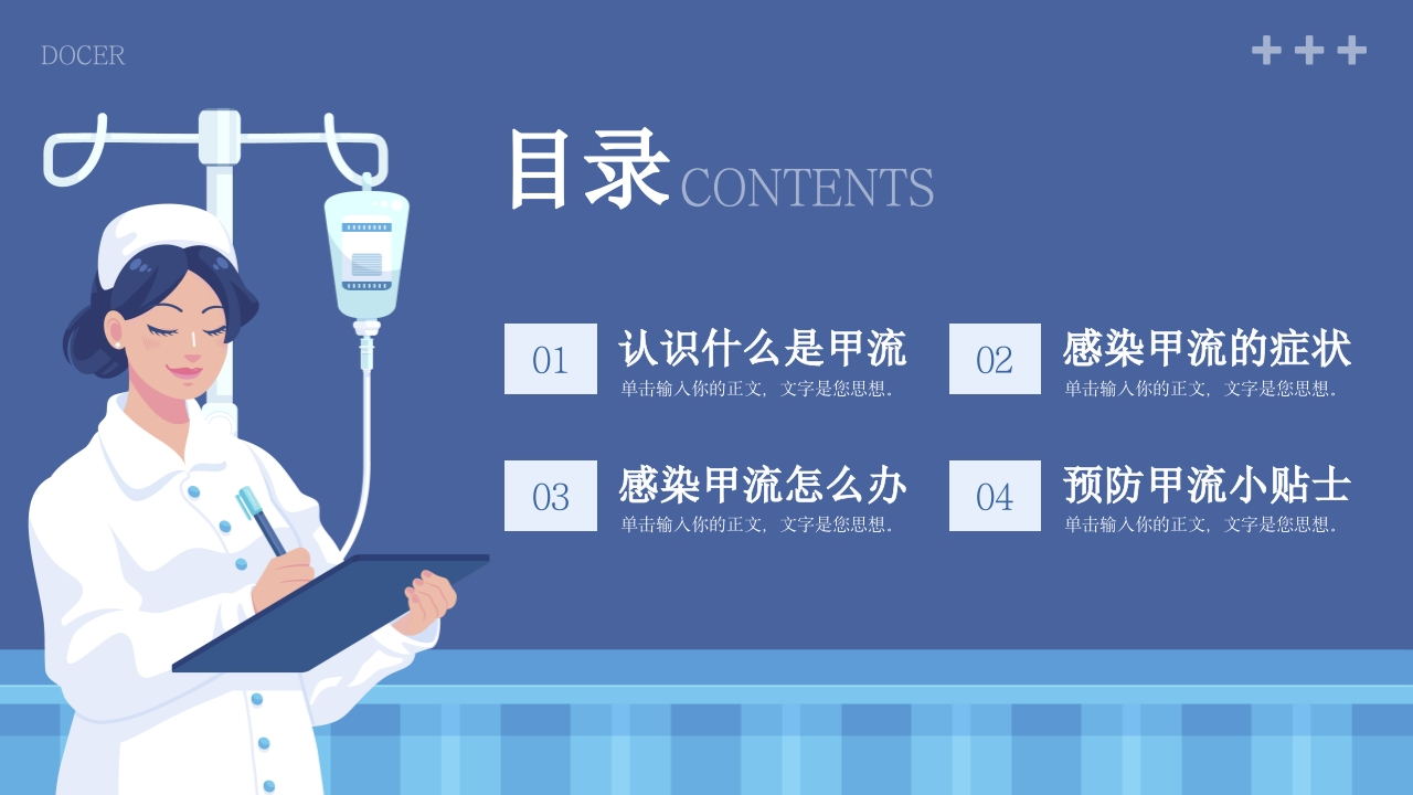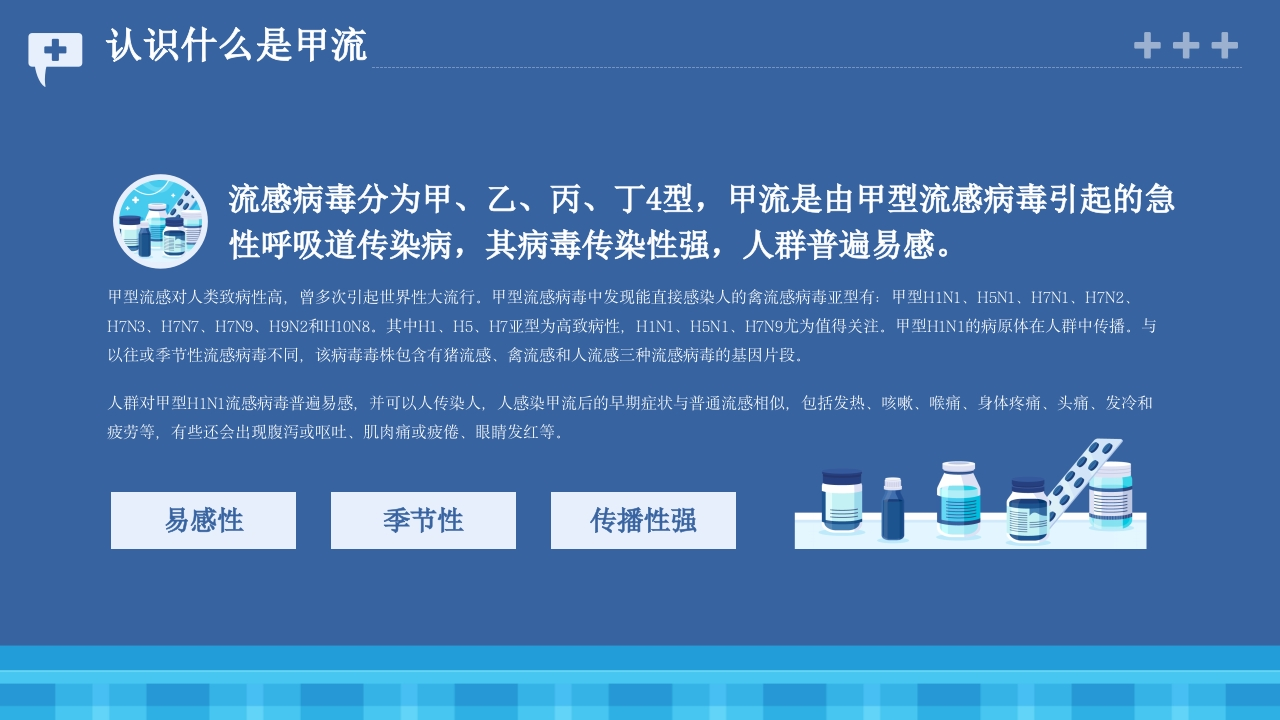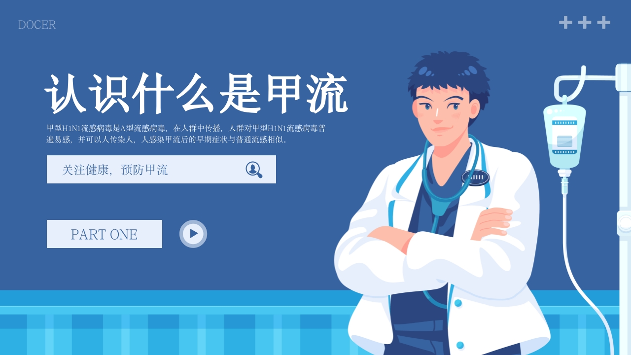 DOCER++十甲型流感病毒科普春季传染病甲型H1N1流感病毒是A型流感病毒,在人群中传播,人群对甲型H1N1流感病毒普111111遍易感,并可以人传染人,人感染甲流后的早期症状与普通流感相似关注健康,预防甲流汇报人:XXx