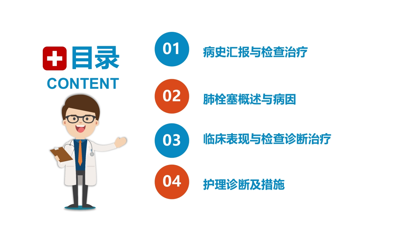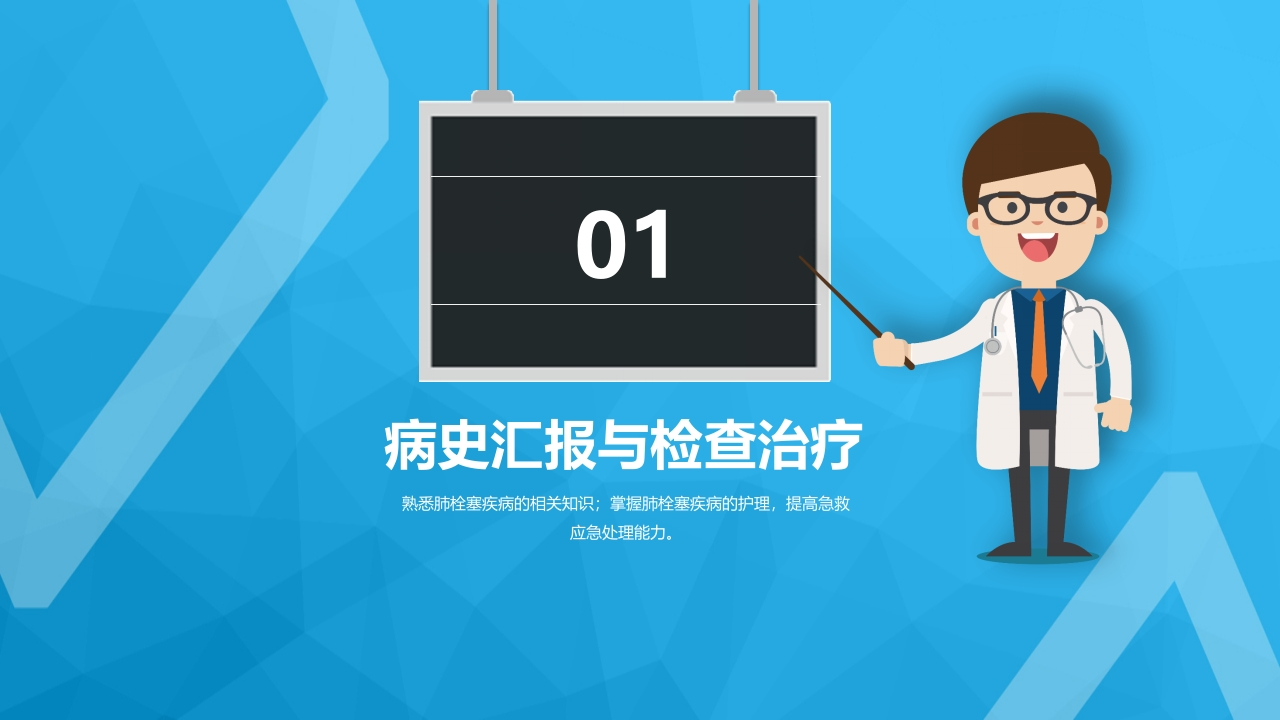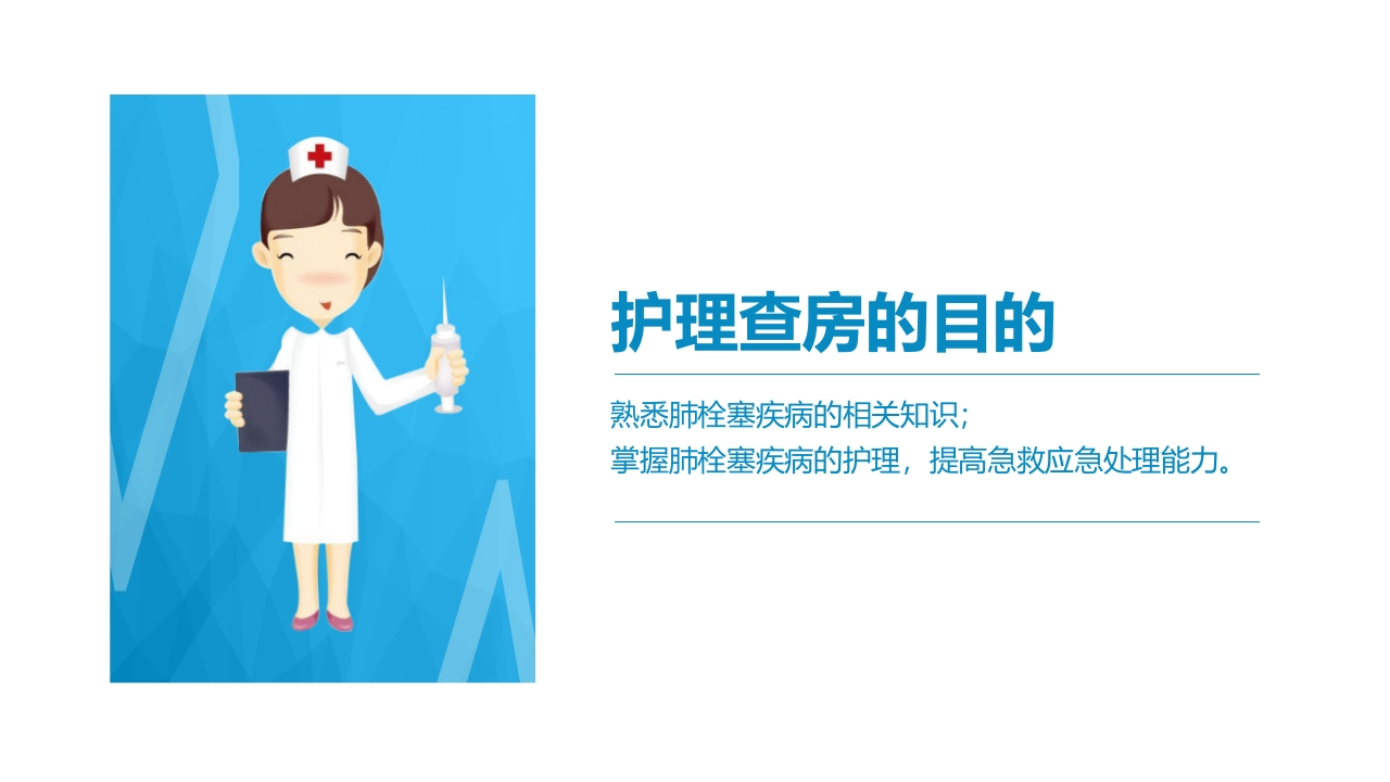 /病史汇报与检查治疗肺栓塞概述与病因临床表现与检查诊断治疗/护理诊断及措施心内科护理查房肺栓塞病人的护理熟悉肺栓塞疾病的相关知识;掌握肺栓塞疾病的护理,提高急救应急处理能力。