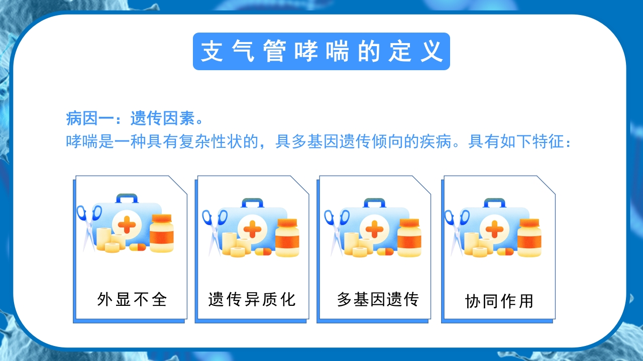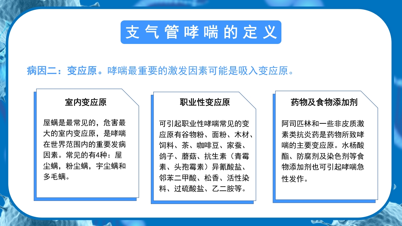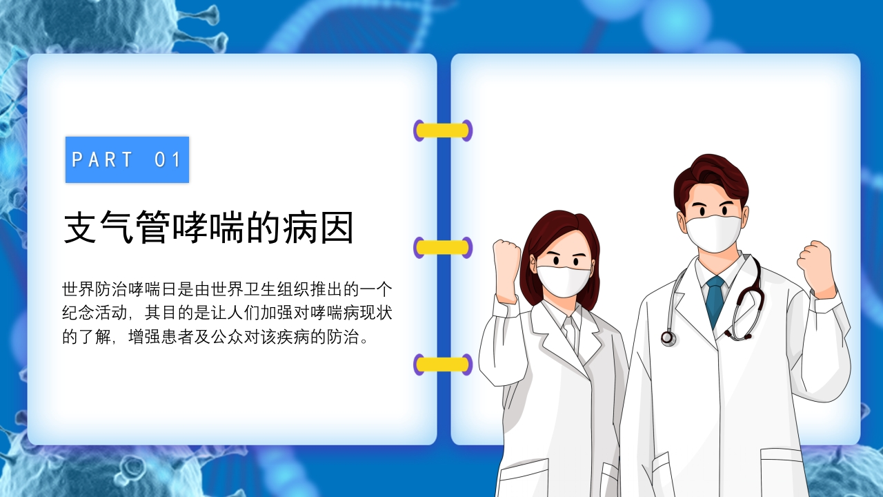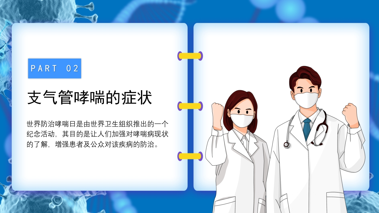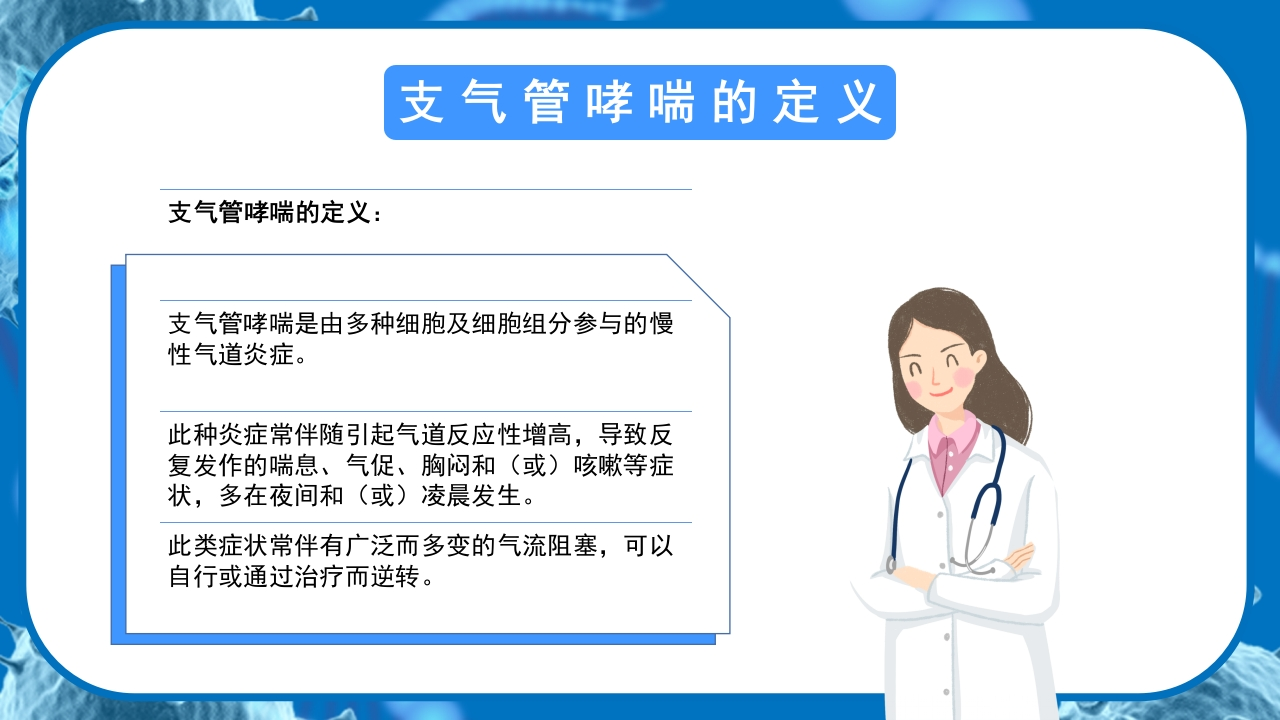 医疗知识讲座支气管哮喘预防世界防治哮喘日是由世界卫生组织推出的一个纪念活动,其目的是让人们加强对哮喘病现状的了解,增强患者及公众对该疾病的防治。讲卫生勤通风养成好习惯